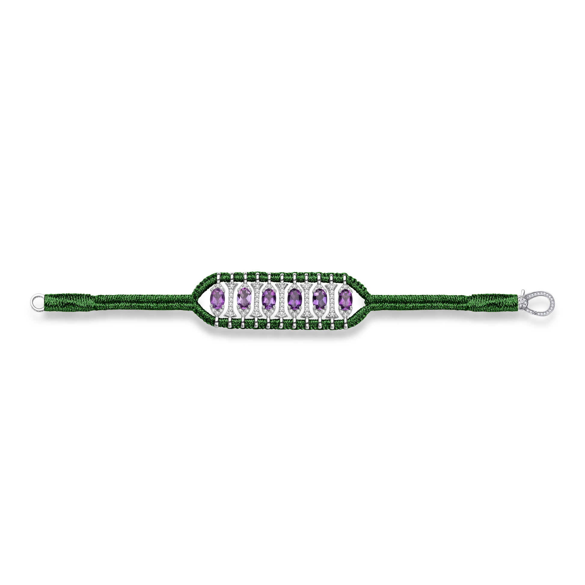 Bracelet in pine color lurex thread decorated with a motif in silver 925 entirely paved with moissanites and enhanced with Amethysts.
