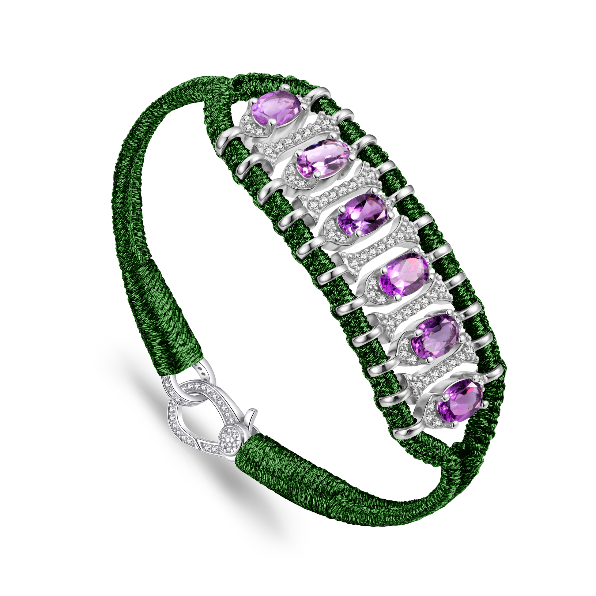Bracelet in pine color braided lurex thread decorated with a motif in silver 925 entirely paved with moissanites and enhanced with Amethysts.