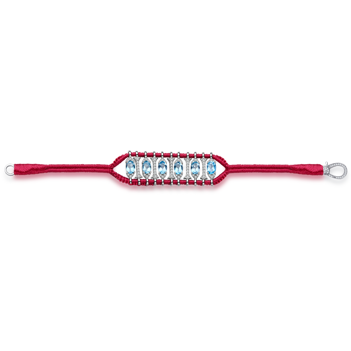 Bracelet in rani color cotton thread decorated with a motif in silver 925 entirely paved with moissanites and enhanced with blue Swiss topazes.