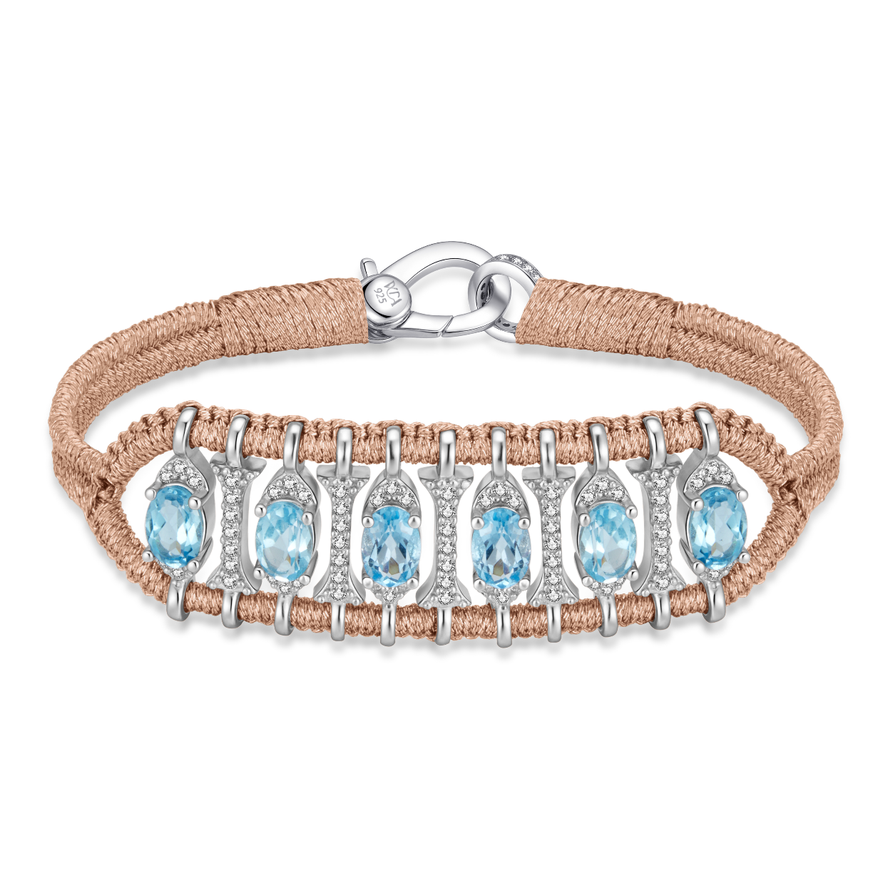 Bracelet in pink gold color lurex thread decorated with a motif in silver 925 entirely paved with moissanites and enhanced with blue Swiss topazes.