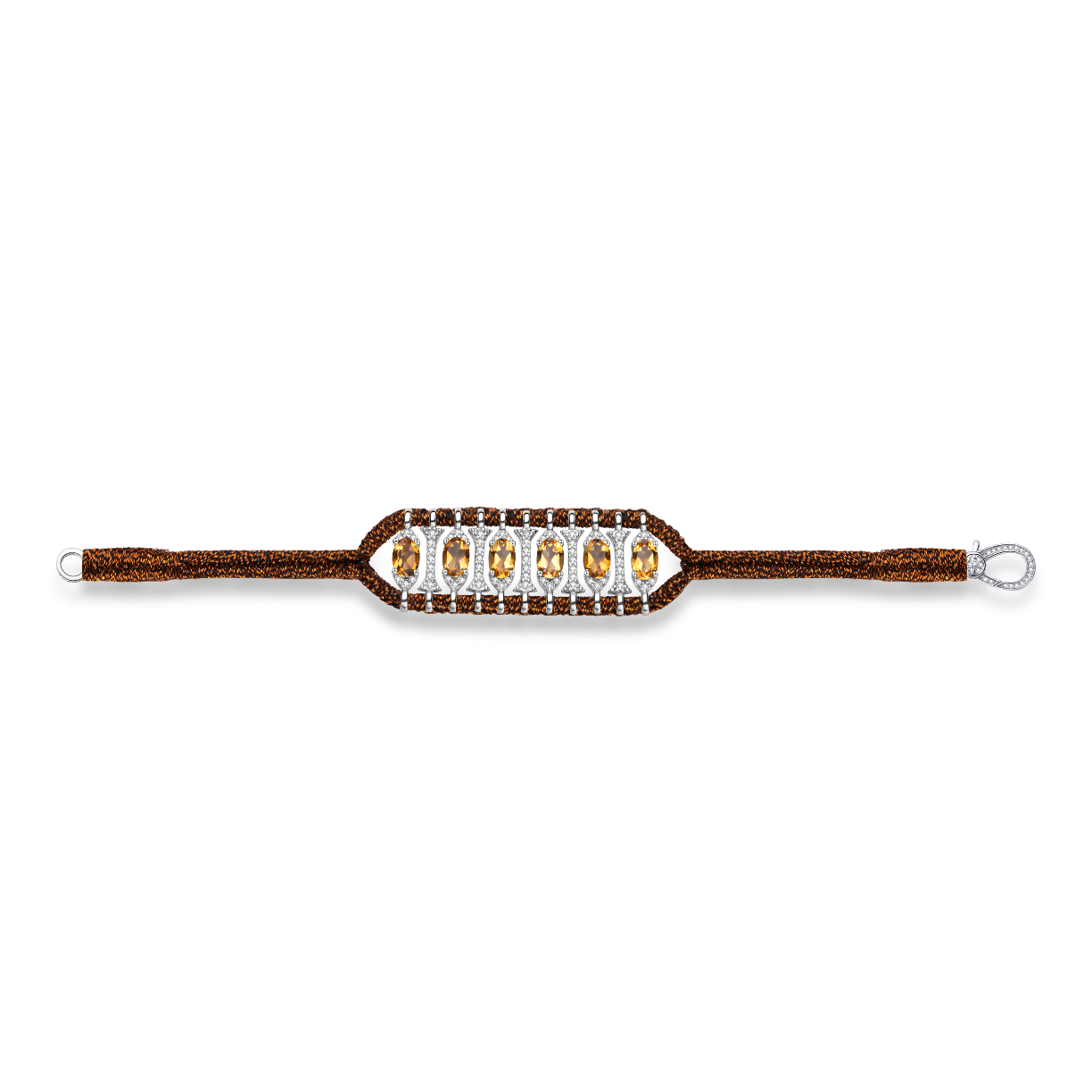 Bracelet in rusty lurex thread decorated with a motif in silver 925 entirely paved with moissanites and enhanced with citrines.