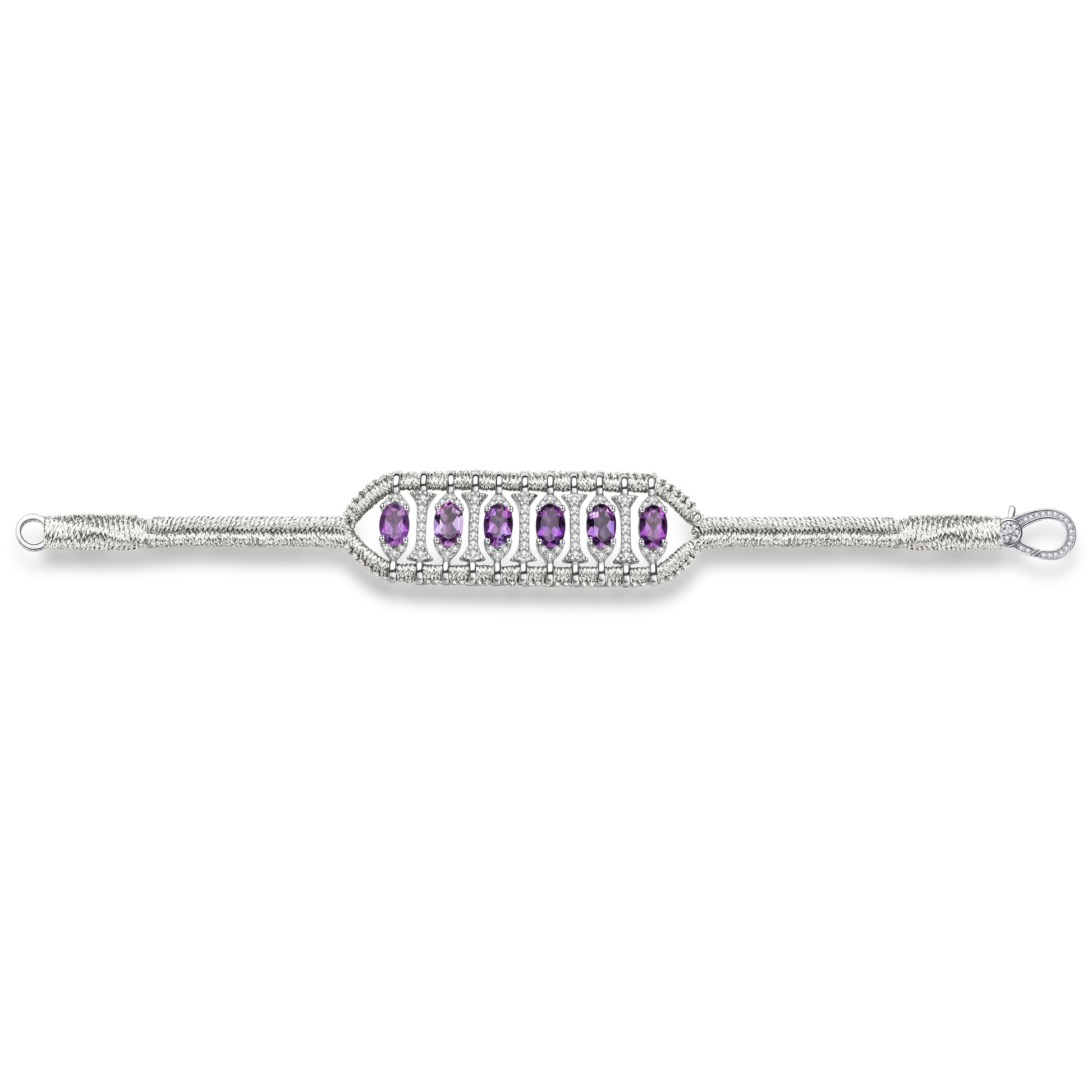 Bracelet in silver color braided lurex thread decorated with a motif in silver 925 entirely paved with moissanites and enhanced with Amethysts.