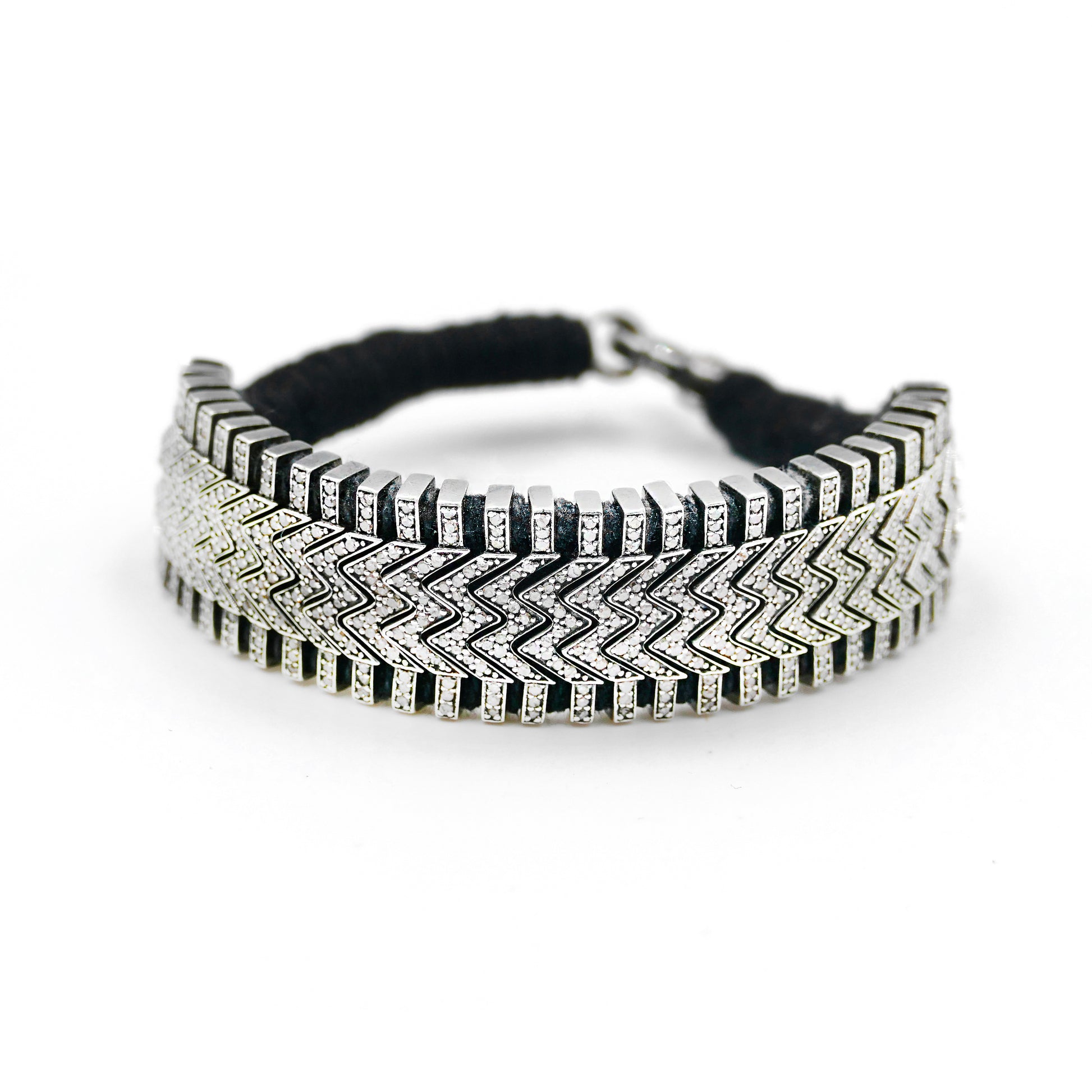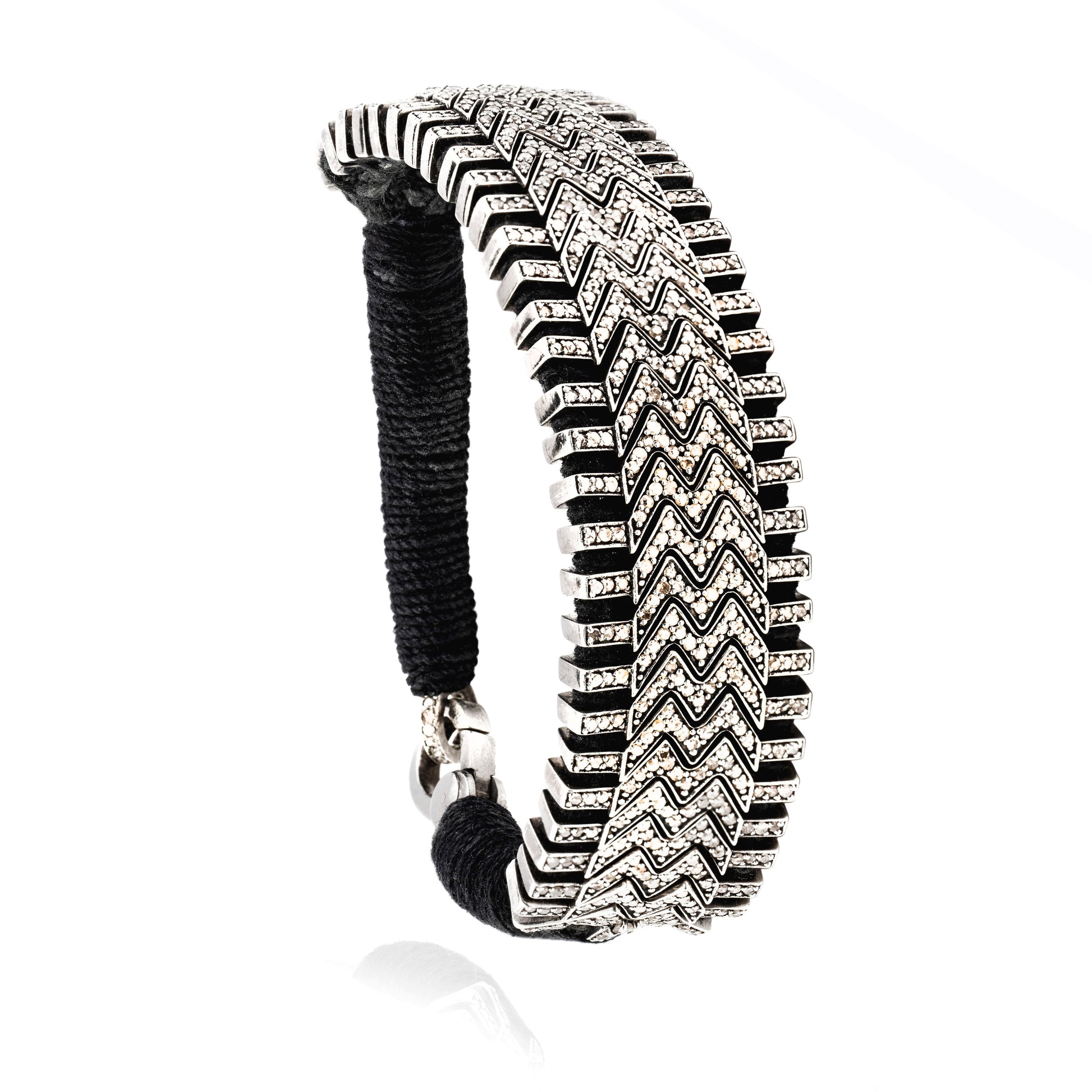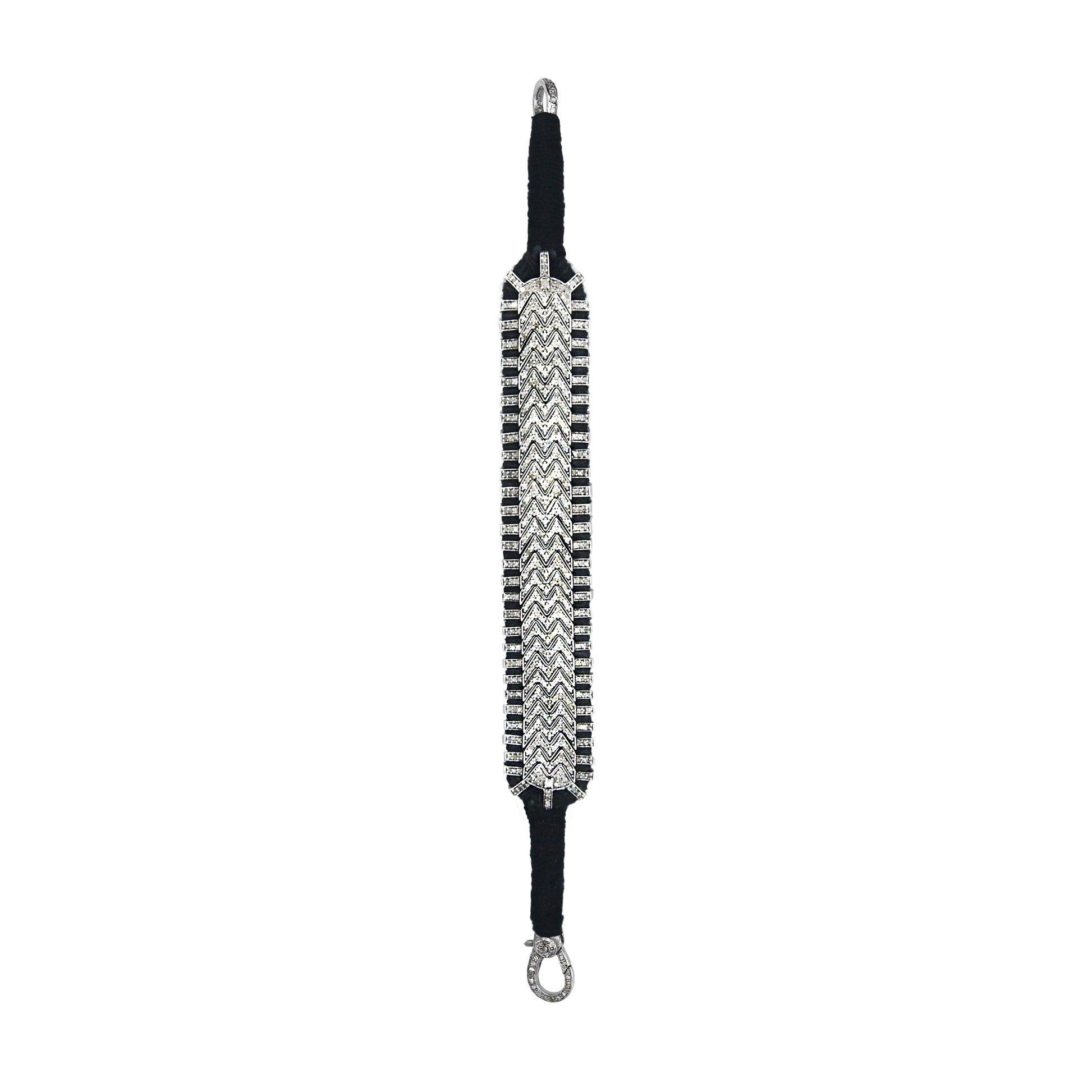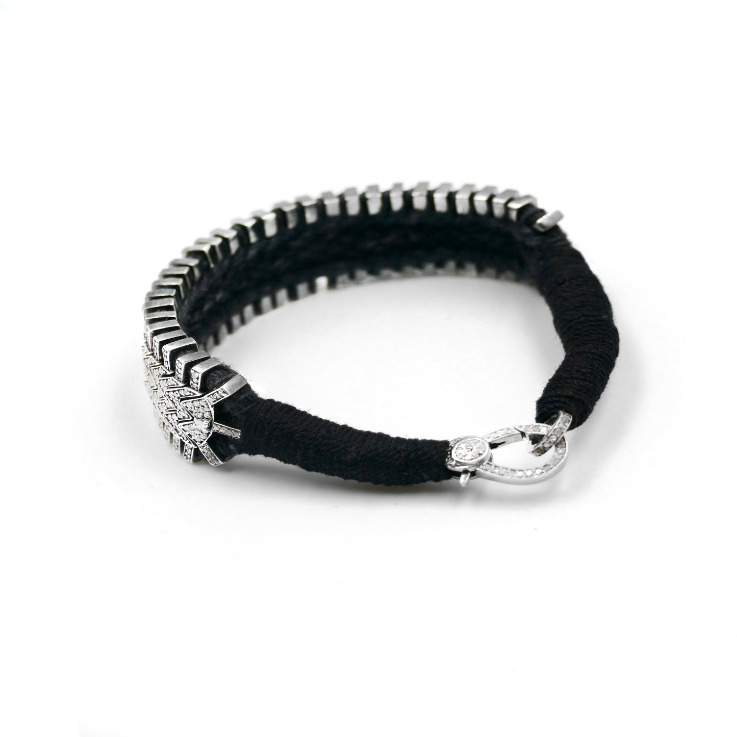 This sublime bracelet made of black thread and decorated with a double chevron silver pattern, itself set with more than 400 diamonds.