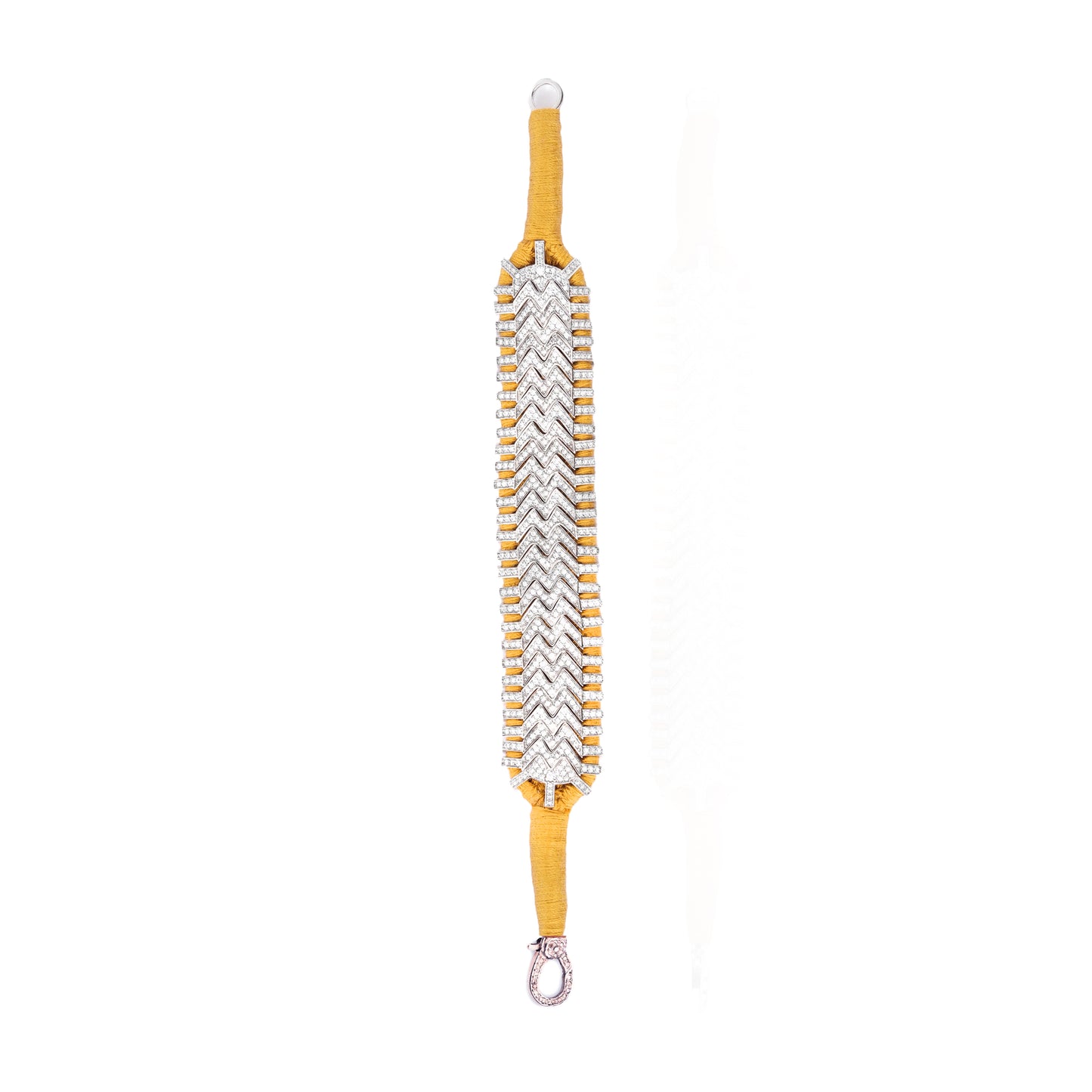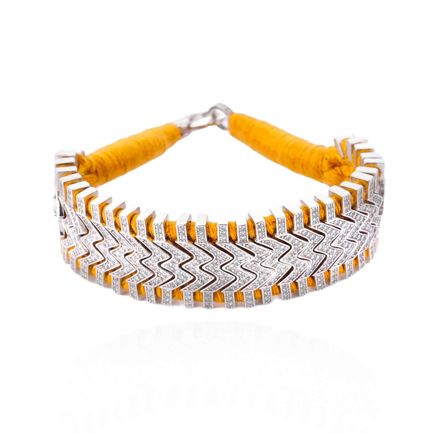 This sublime bracelet made of saffron thread and decorated with a double chevron silver pattern, itself set with more than 400 diamonds.