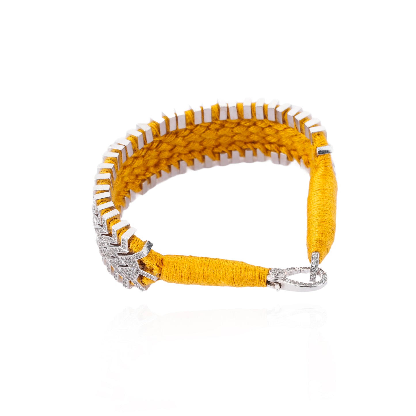 Saffron-colored braided cotton thread bracelet decorated with a 925 silver motif and set with a multitude of diamonds.