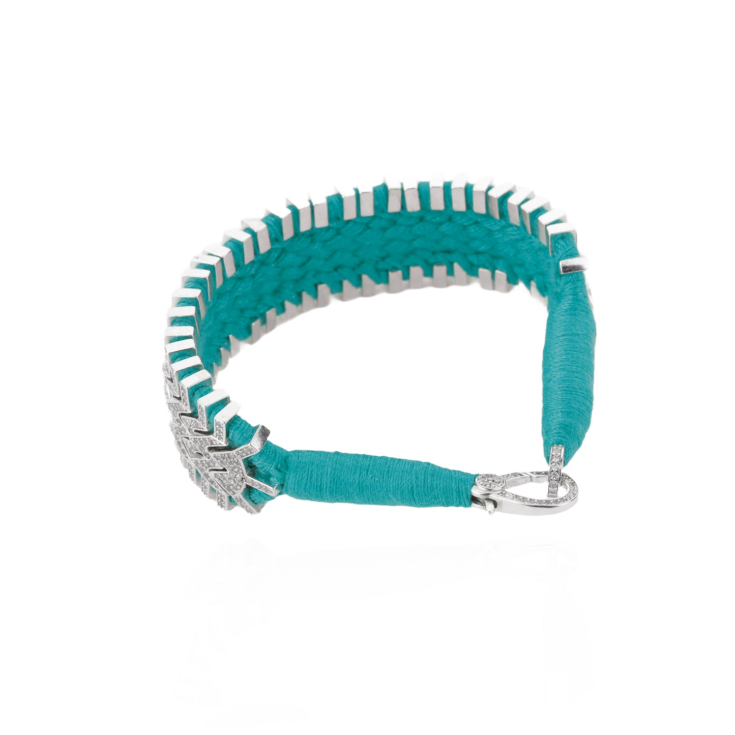 Turquoise-colored braided cotton thread bracelet decorated with a 925 silver pattern and set with a multitude of diamonds.
