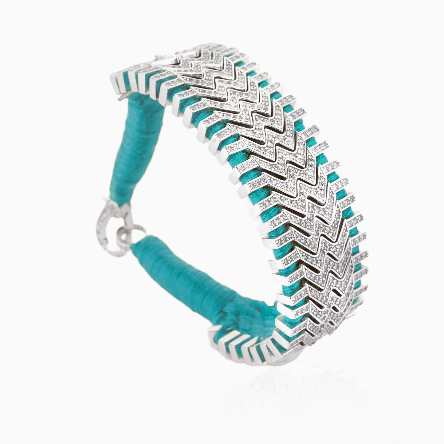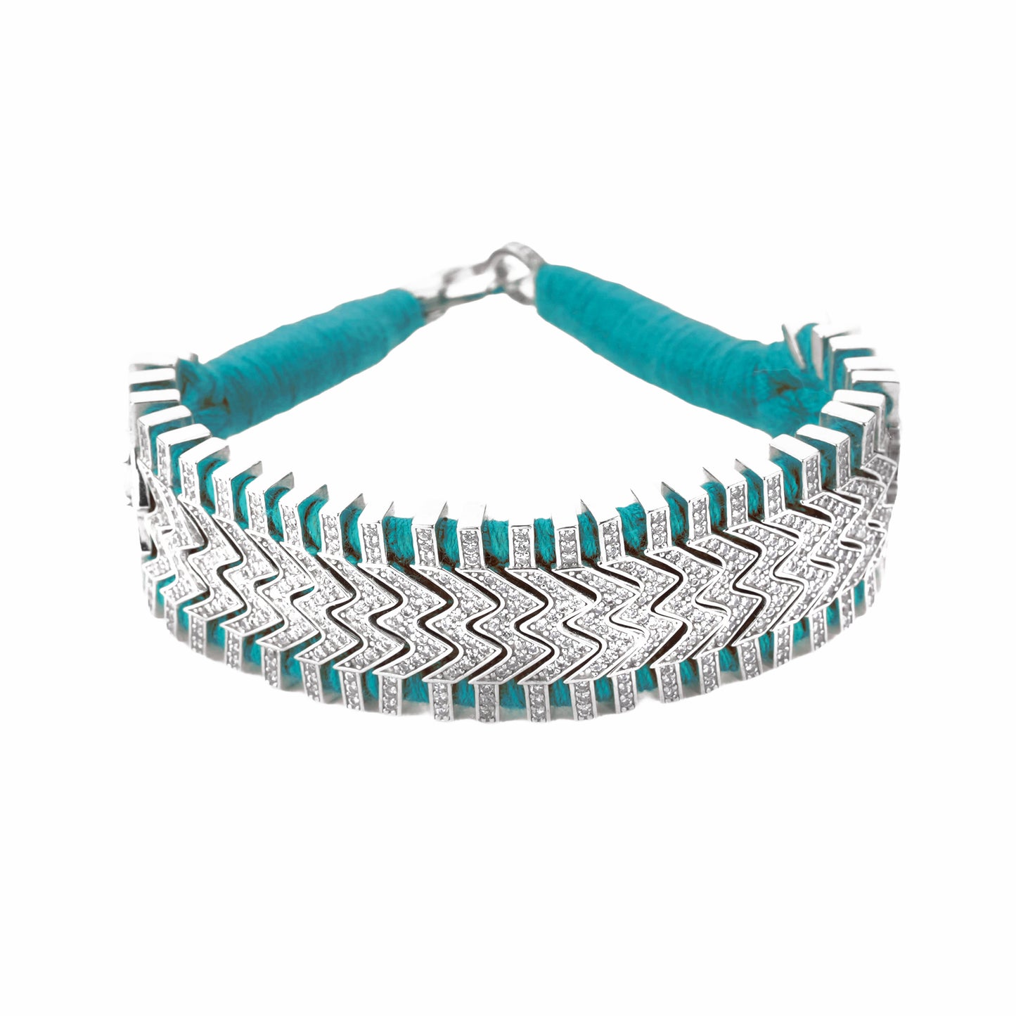 This sublime bracelet made of turquoise thread and decorated with a double chevron silver pattern, itself set with more than 400 diamonds.