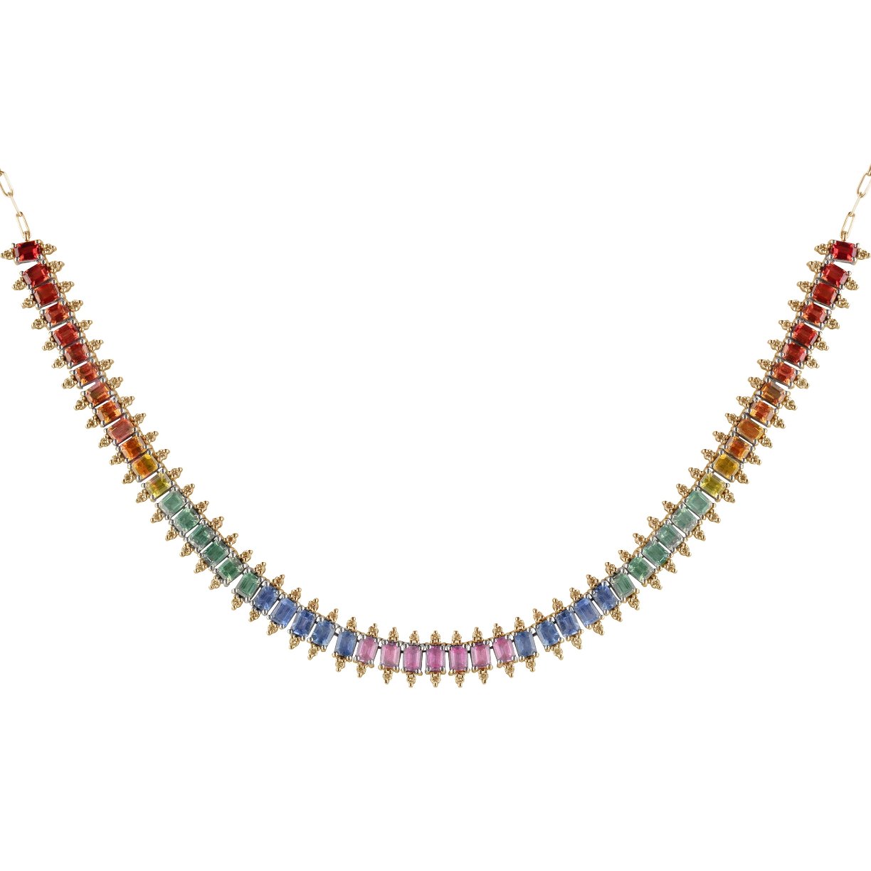 This necklace and our precious novelty ! It is composed of a 14k Gold structure, each link of which is decorated with multiple colored sapphires arranged in a rainbow gradient and enhanced with 2 diamonds. a fairly fine piece but which certainly does not go unnoticed...