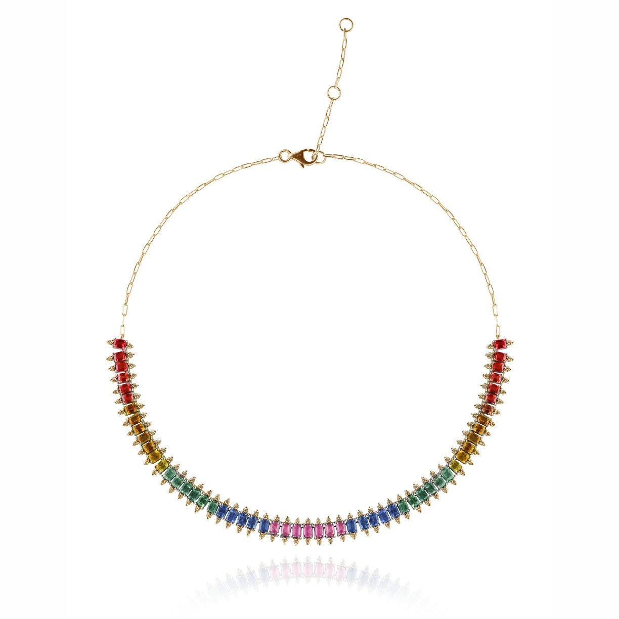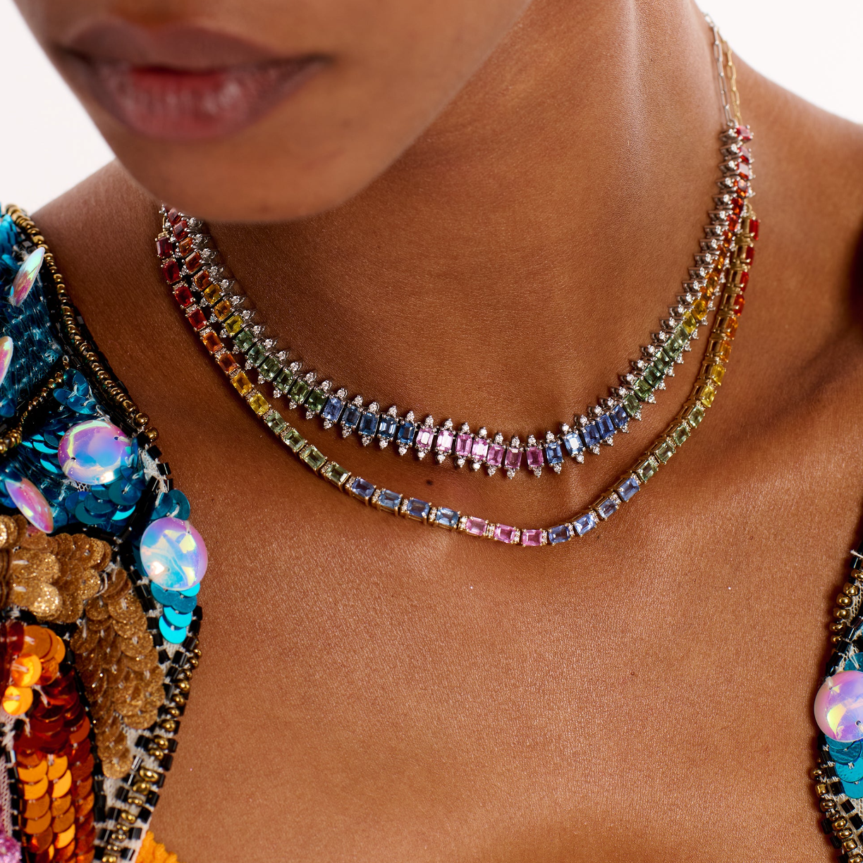 14k Gold necklace adorned with multiple rainbow gradient sapphires , each decorated on either side with 2 small diamonds .