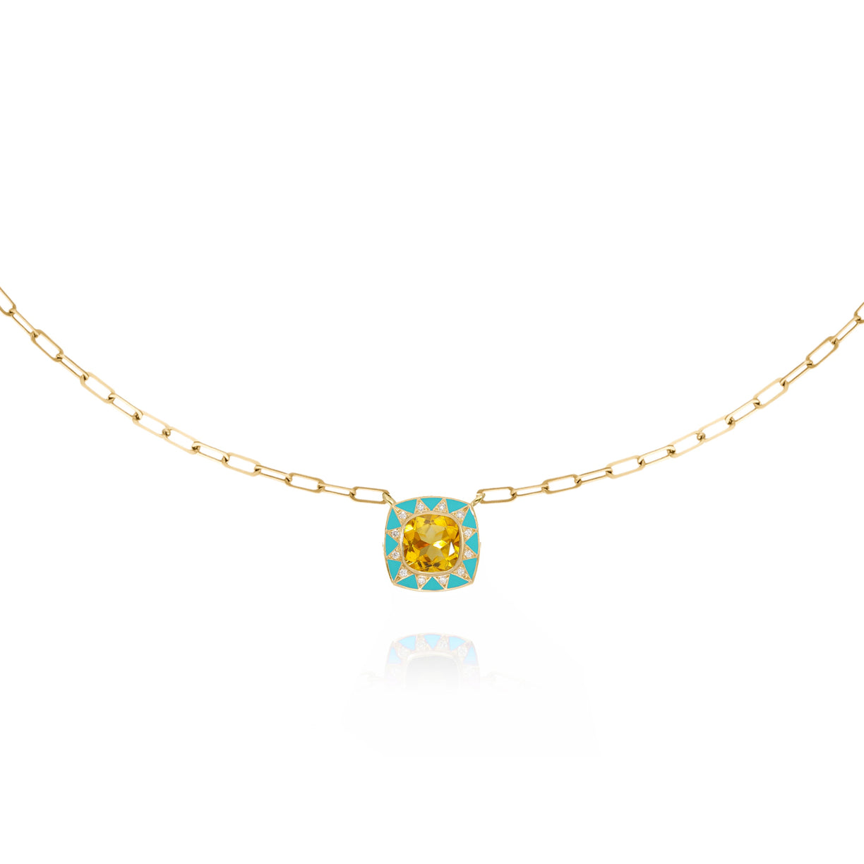 This lovely necklace 18k yellow gold combines extravagance and refinement. The cabochon in its center represents a star. Heavenly and mysterious, this medal equipped with a diopside, sparkles with a thousand lights with its diamonds and neon pink enamel.