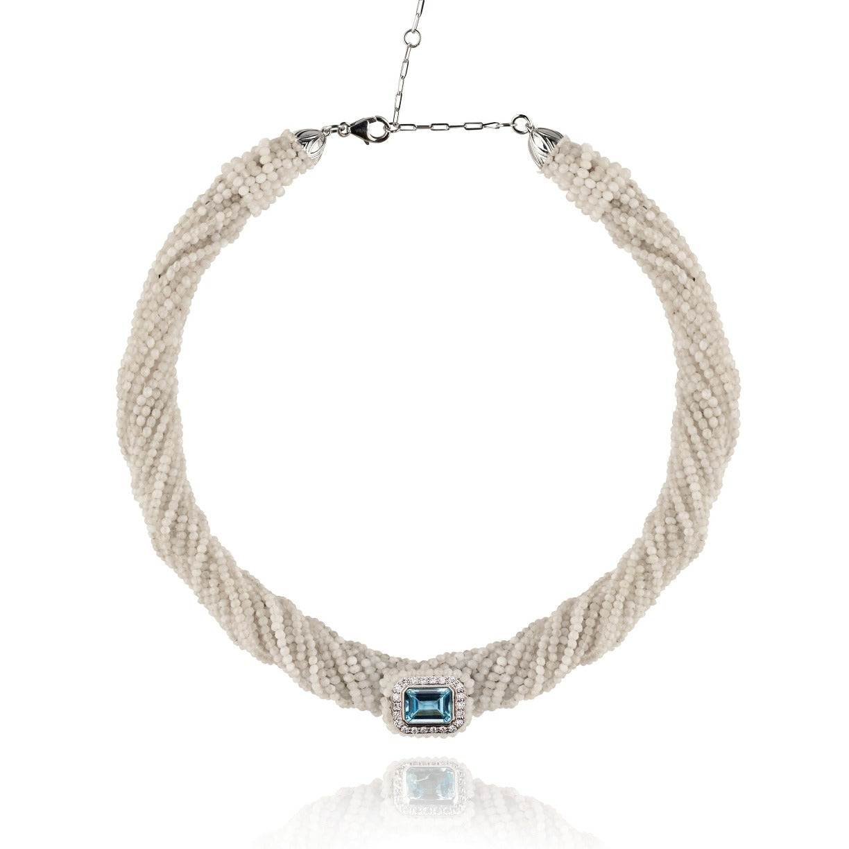 In the line of the Molly String with its structure with multiple links, the Tornado, is a new iconic piece of our house. Its twisted links around the central cabochon, composed of 925 silver and set with diamonds, it reveals all the beauty of a Sky blue topaz set in its center. Wear it alone, as a choker, to enhance your head posture or combined with our Feather or Leaf pendants mounted on a chain to create a play of lengths, the Tornado will become the centerpiece of your style.