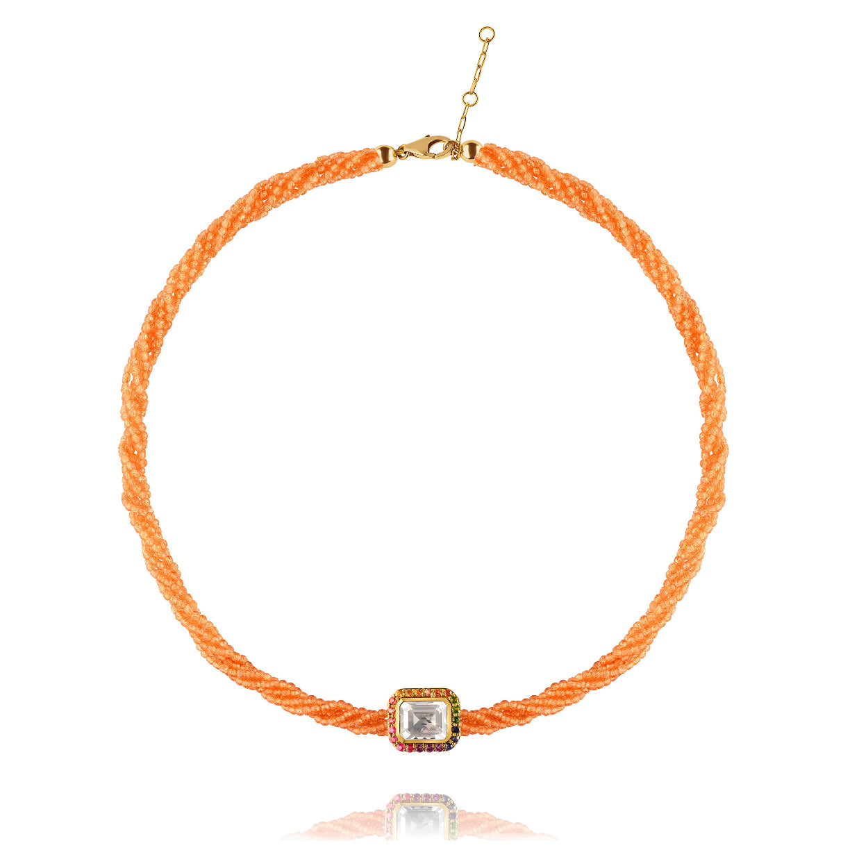 In the line of the Tornado with its multiple links structure, the Twist necklace is a new iconic piece of our house. Its twisted ties are finer than the Tornado around a central cabochon, made of 14k gold and set with diamonds. It reveals all the beauty of a Quartz Crystal set in its center and set with Stones in rainbow gradient. Wear it alone, as a choker, to sublimate your head port or combined with our pendants Plume or Leaf mounted on chain to create a game of lengths, the Tornado will become the centerpiece of your style.