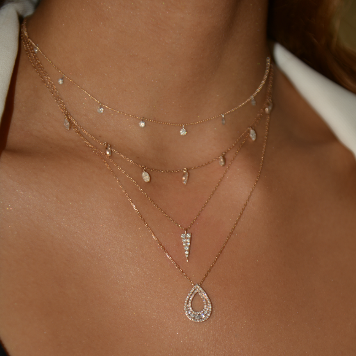 Necklace in18k rose gold is a piece of rare subtlety. It is made up of a fine ball-knit chain beautifully enhanced with 9 tassels, each set with a delightful diamond and which will sparkle beautifully on your neck. An elegant and sober piece, perfect with an evening outfit or with a more casual outfit.
