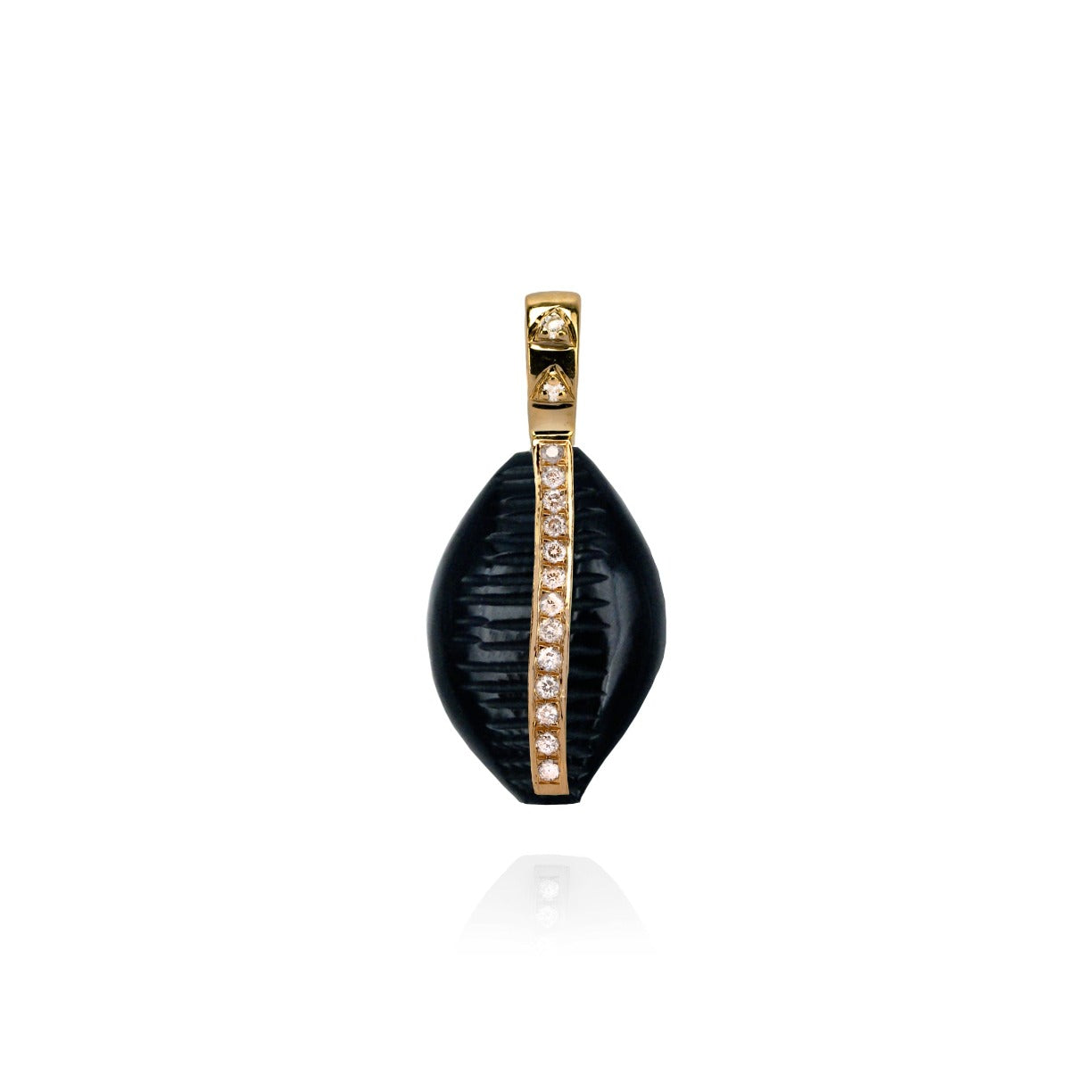 Lovely pendant in onyx representing a “cowrie” shell. It is carved from stone using the carving technique. It is paved with 10 diamonds on a white gold setting. The 14-carat yellow gold bail is decorated with two diamonds which underline the precious aspect. The shell is an invitation to escape, to contemplate the ocean, to respect nature. This pendant can be worn on a thin or thicker chain thanks to its 14-carat gold bail decorated with two small diamonds, which is wide enough to allow links of 3mm in diameter to pass through. Why not also wear this magnificent jewelry on a hoop for a 100% fashion look.