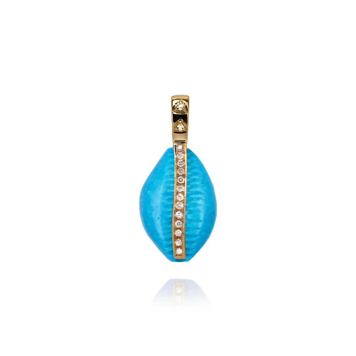 Lovely pendant in turquoise representing a “cowrie” shell. It is carved directly from the stone using what we call the carving technique. It is paved with 10 diamonds on a white gold setting. The 14-carat yellow gold bail is decorated with two diamonds which underline the precious aspect. The shell is an invitation to escape, to contemplate the ocean, to respect nature. This pendant can be worn on a thin or thicker chain thanks to its 14-carat gold bail decorated with two small diamonds, which is wide enough to allow links of 3mm in diameter to pass through. Why not also wear this magnificent jewelry on a hoop for a 100% fashion look.