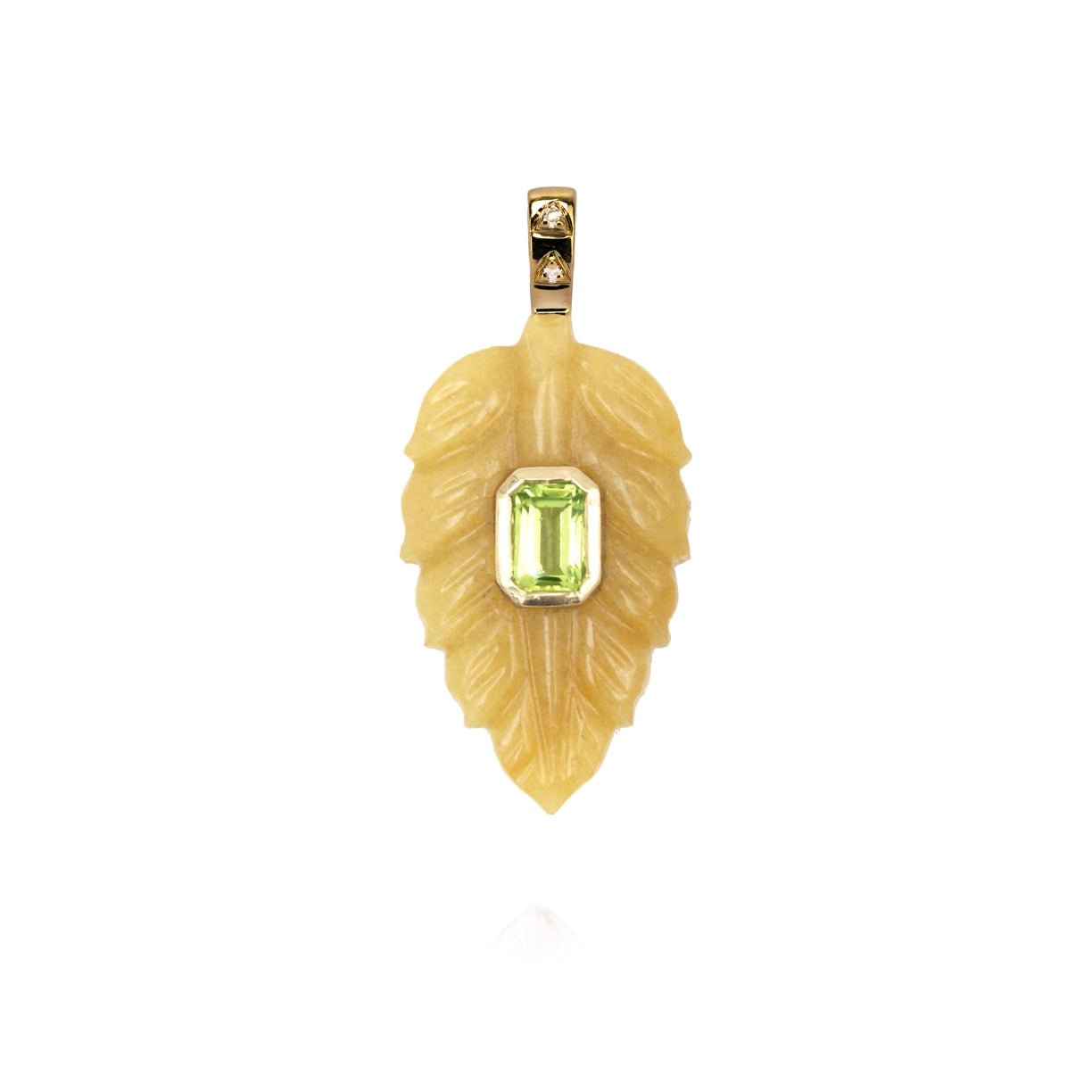 Pendant representing a leaf in Aventurine, peridot, diamonds and 14 carat gold .