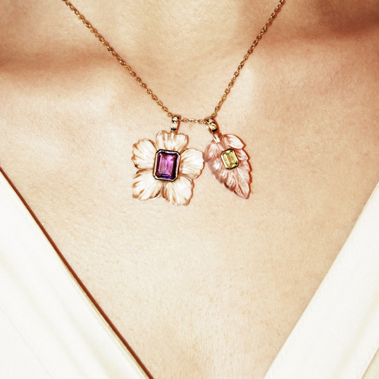 Lovely pendant in rock crystal representing a sublime flower. This pendant is carved from the stone using the carving technique. This flower is set in its center with an amethyst emerald cut. The flower can be the symbol of friendship but also joy and hope. This pendant can be worn on a thin or thicker chain thanks to its 18k gold bail decorated with two small diamonds, which is wide enough to allow links of 3mm in diameter to pass through. Why not also wear this magnificent jewelry on a hoop for a 100% fashion look.
