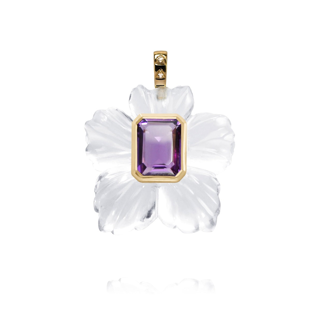 Pendant representing a flower in rock crystal, amethyst, diamonds and 18k gold .