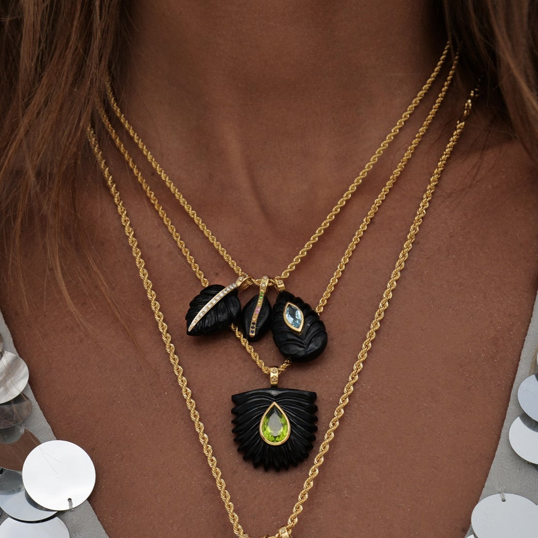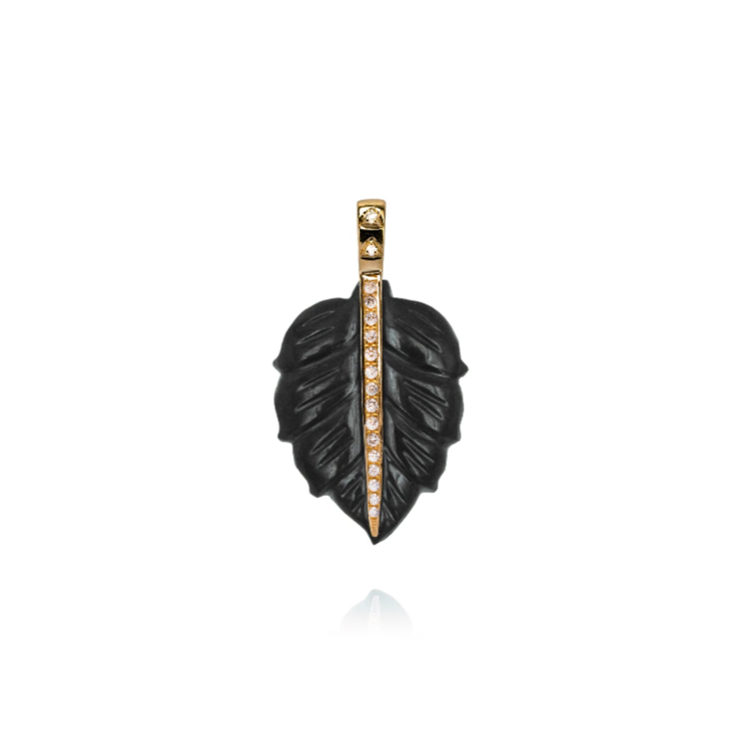Lovely pendant in onyx representing a delicate leaf. It is sculpted directly from the stone using the carving technique. This sheet is paved with 17 diamonds set in 14k yellow gold. The leaf is the symbol of happiness and prosperity. This pendant can be worn on a thin or thicker chain thanks to its 14k gold bail decorated with small diamonds, which is wide enough to allow links of 3mm in diameter to pass through. Why not also wear this magnificent jewelry on a hoop for a 100% fashion look.