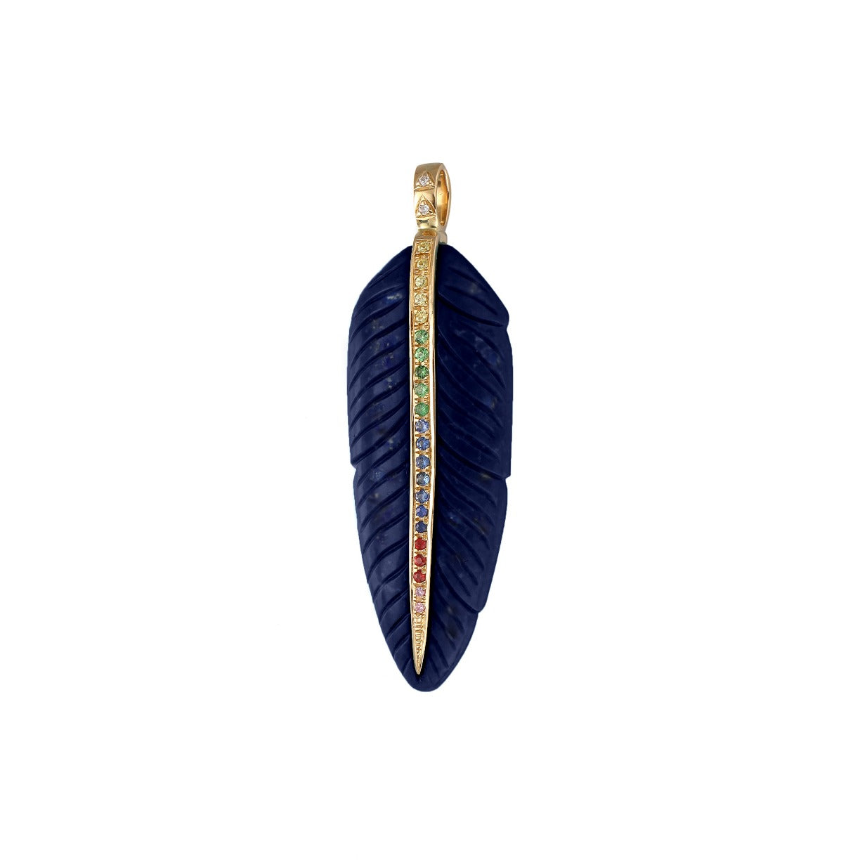 Feather pendant in lapis , rainbow sapphires , diamonds and 18k gold.