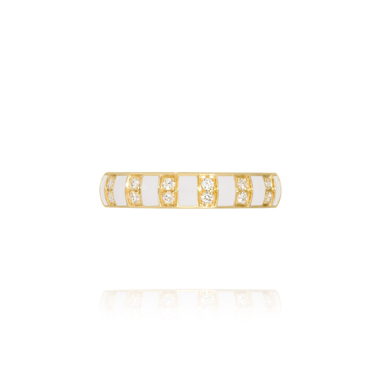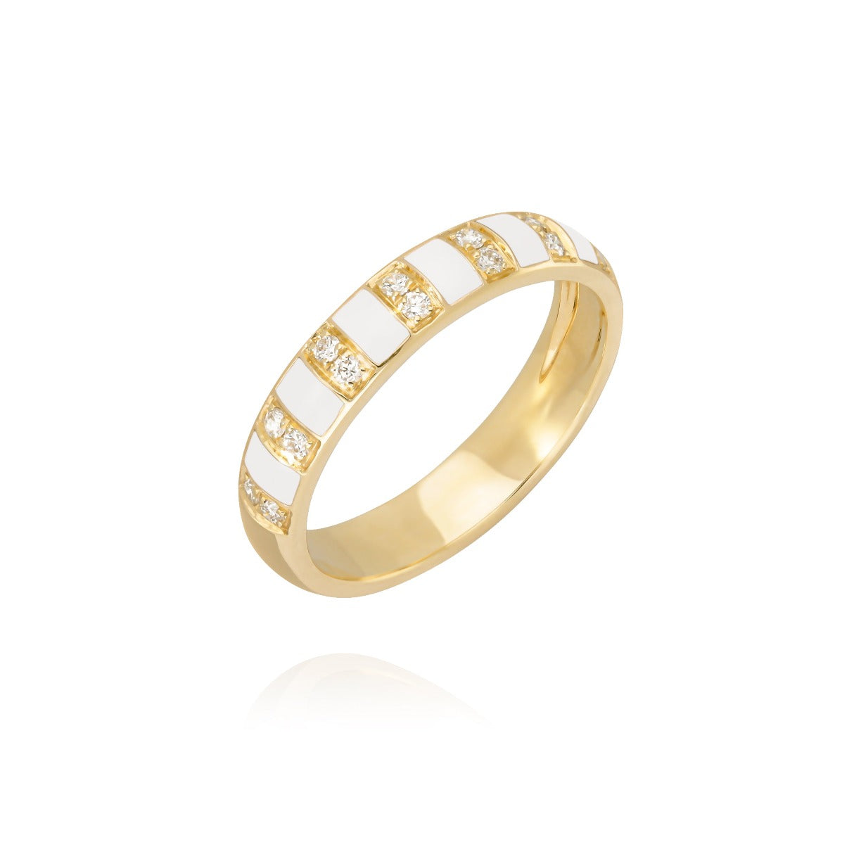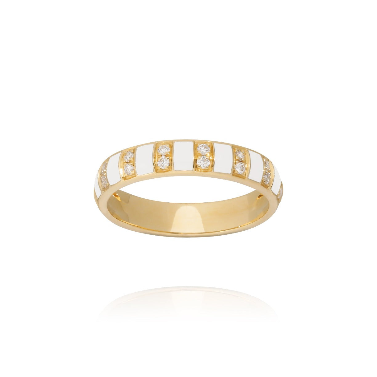 This ring 18k yellow gold is a perfect combination of a classic wedding ring and a more singular style with these white enamel interstices. This ring unfolds its character even more when accumulated with other colors.