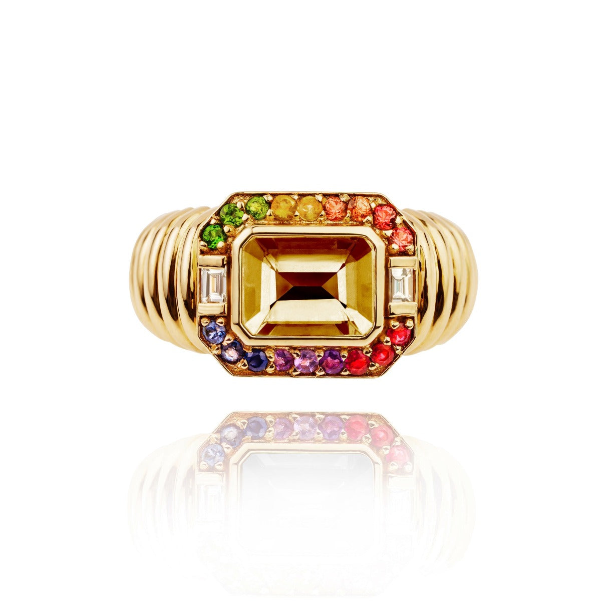 Art deco style gadroon bangle ring in 18-carat gold set with 18 rainbow gradient stones and two baguette diamonds , adorned with an octagonal Citrine .