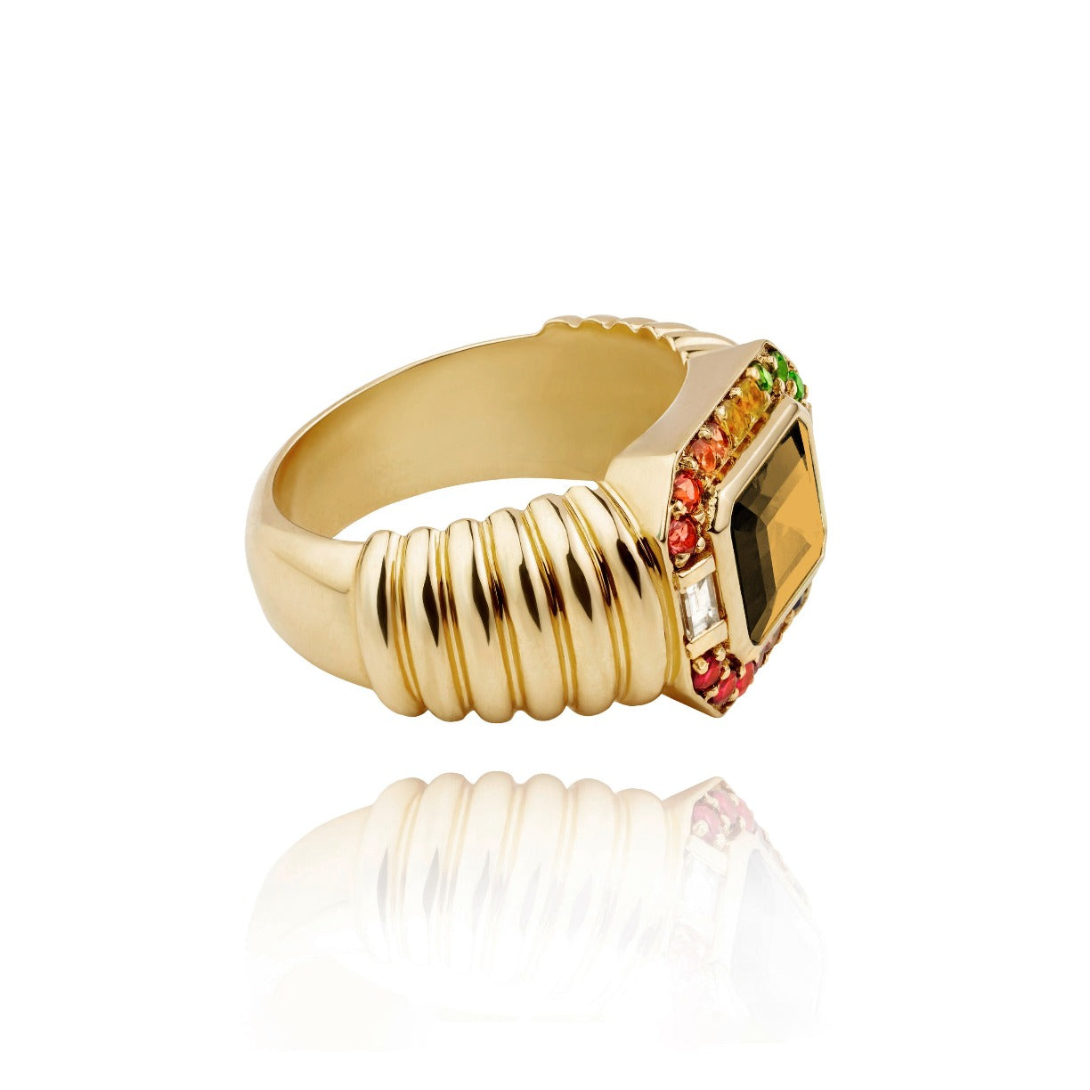 This ring recycled 18k gold is a true marvel. The gadrooned ring body makes it an imposing piece that reminds us of the rings that our mothers kept preciously in their jewelry boxes. In its center, it is decorated with a splendid Citrine sublimated by the stones precious And semi-precious which surround it. An exceptional piece that you will love!