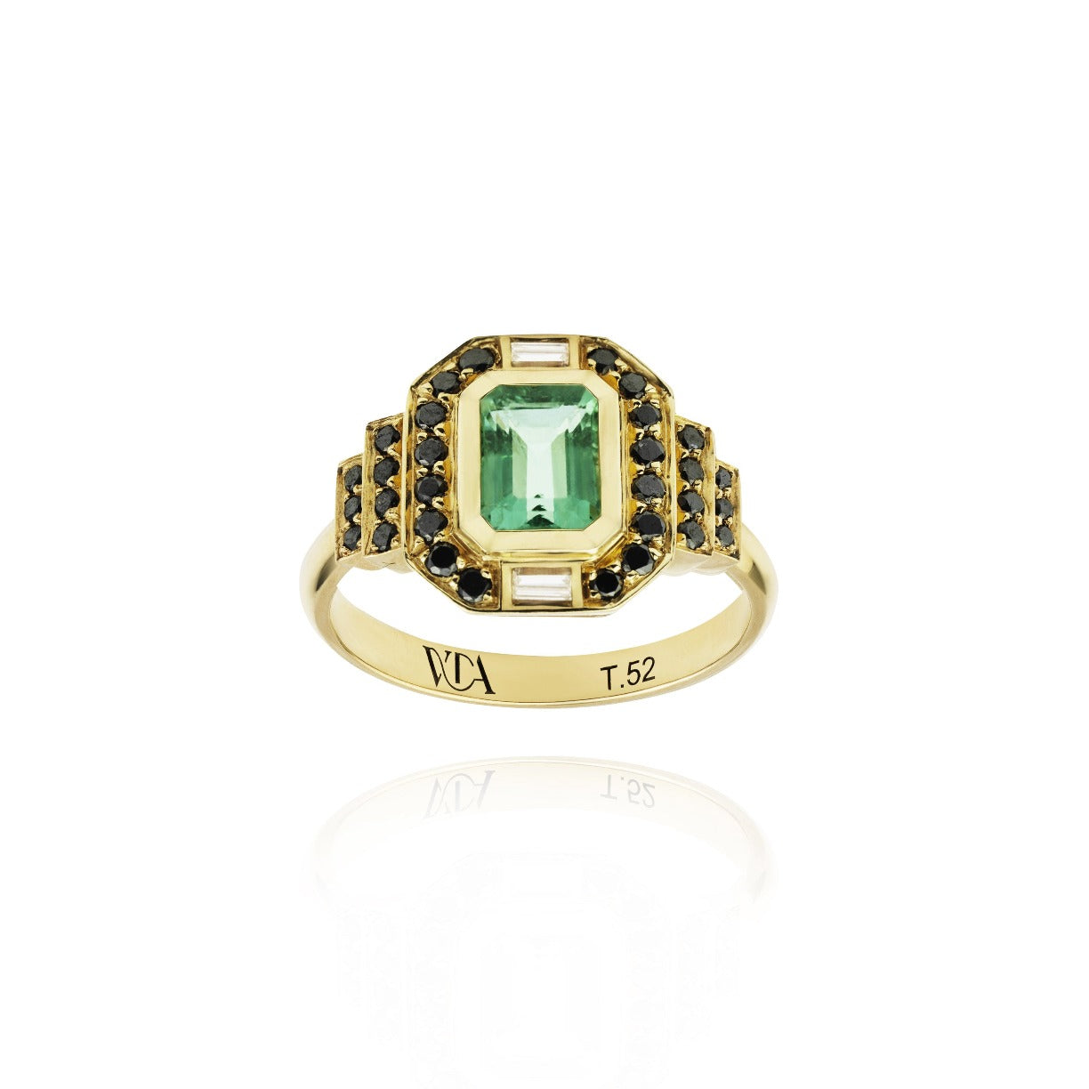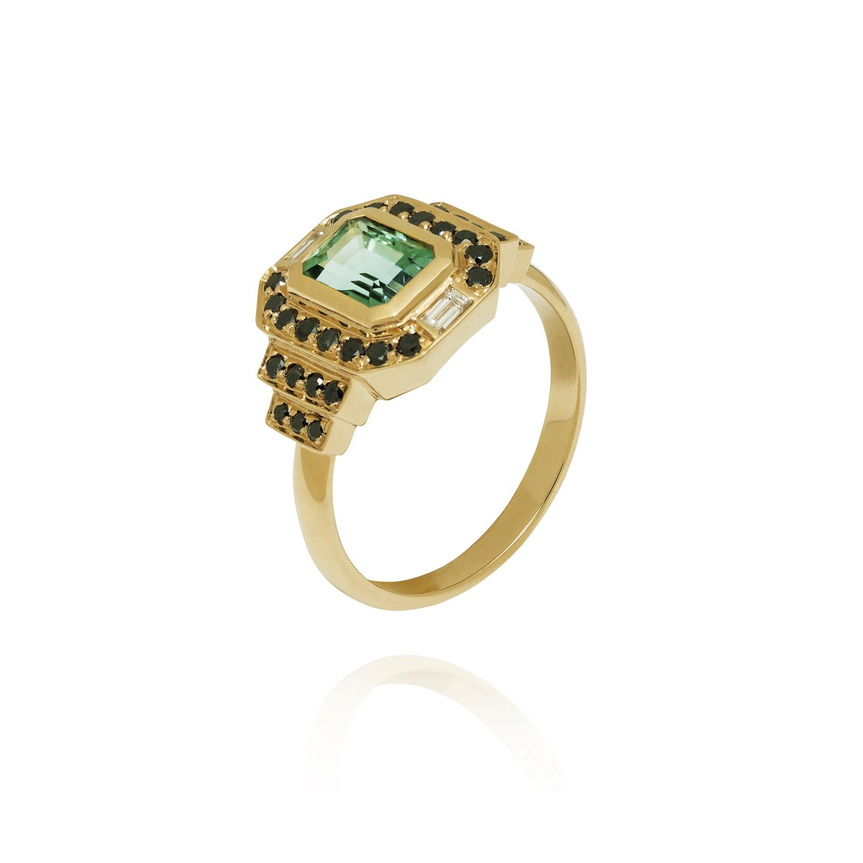 Art Deco inspired ring in 18 carats Gold set with black diamonds and baguette diamonds with a green Tourmaline in its center.