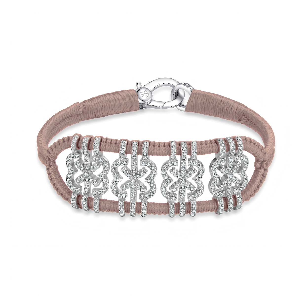 Nude braided cotton thread bracelet, decorated with a 925 silver pattern and set with a multitude of moissanites .