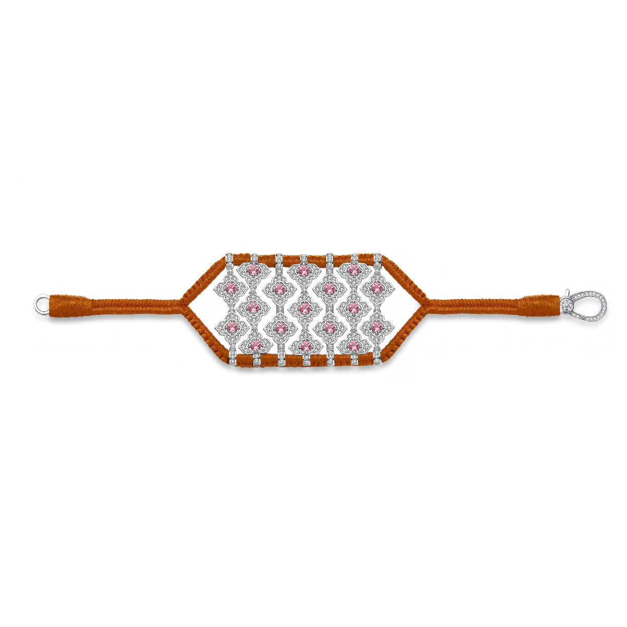 Large camel braided cotton wire cuff decorated with a 925 silver structure entirely paved with moissanites and Tourmalines.