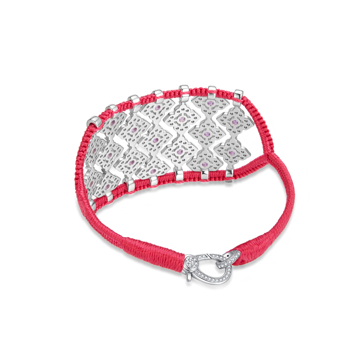 Large Rani braided cotton wire cuff decorated with a 925 silver structure entirely paved with moissanites and Amethysts.