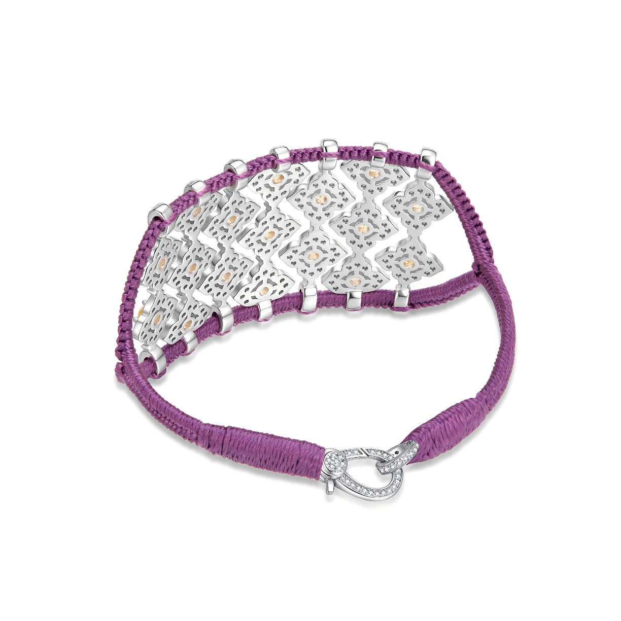 Large purple braided cotton wire cuff decorated with a 925 silver structure entirely paved with moissanites and Citrines.