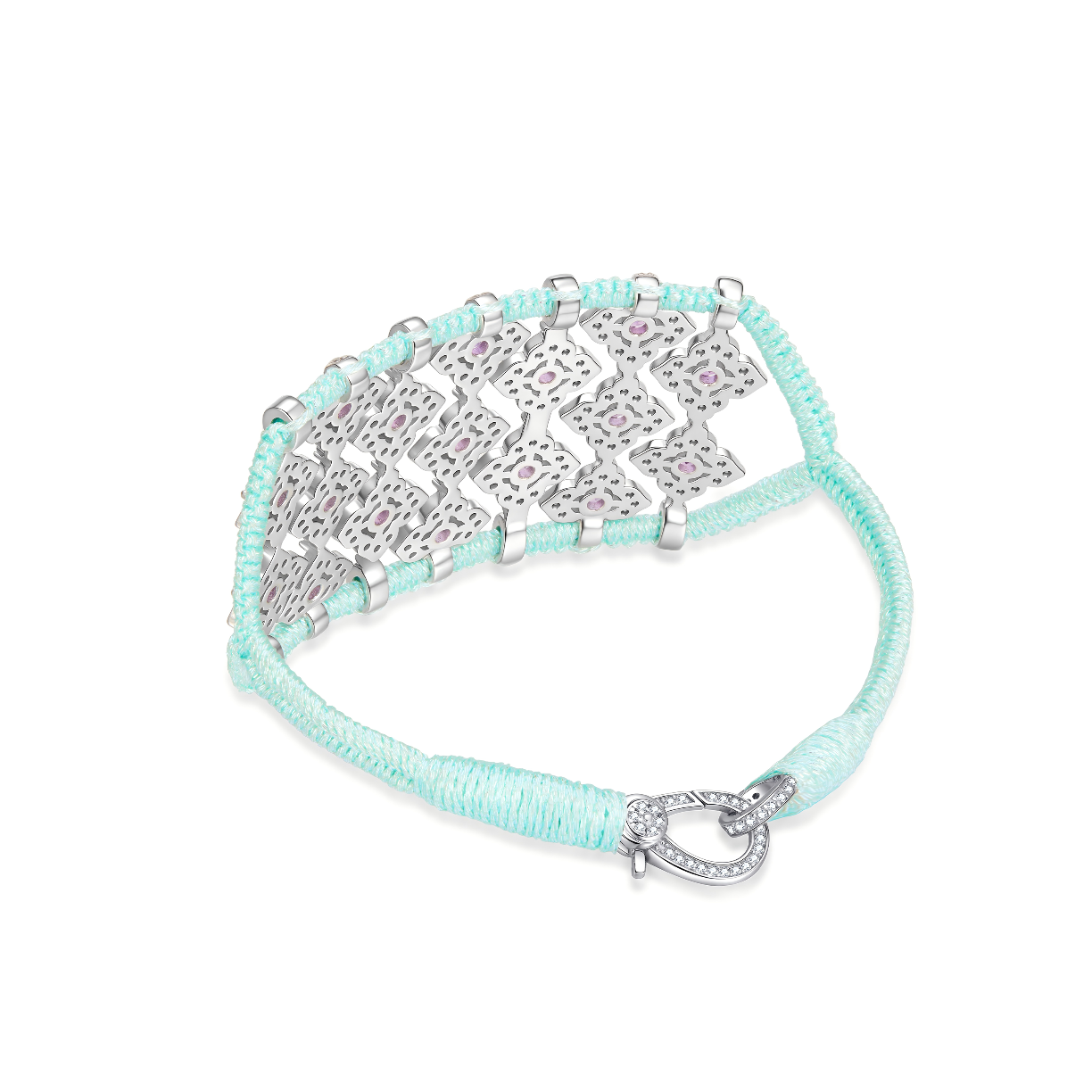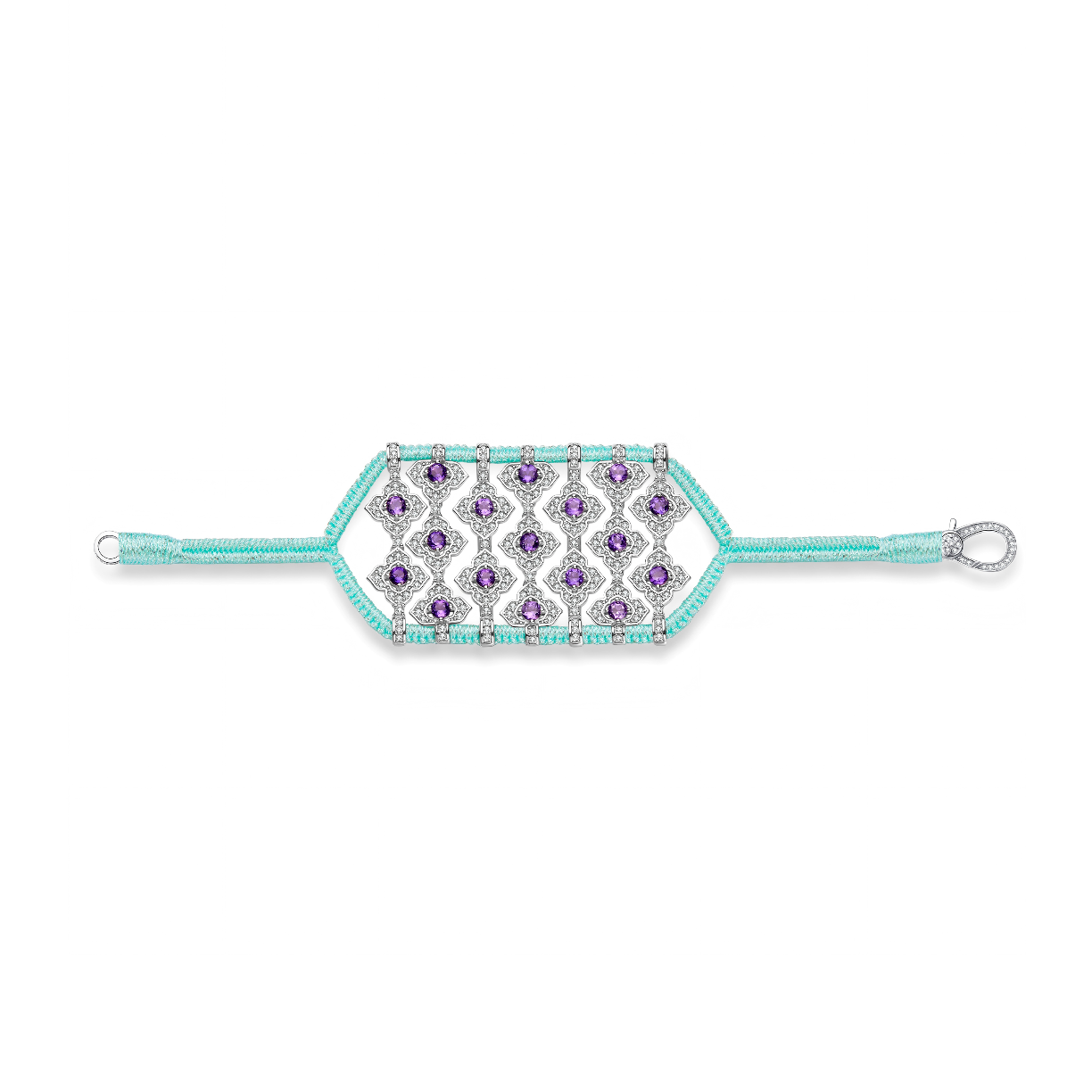 Large Water color braided lurex wire cuff decorated with a 925 silver structure entirely paved with moissanites and Amethysts.