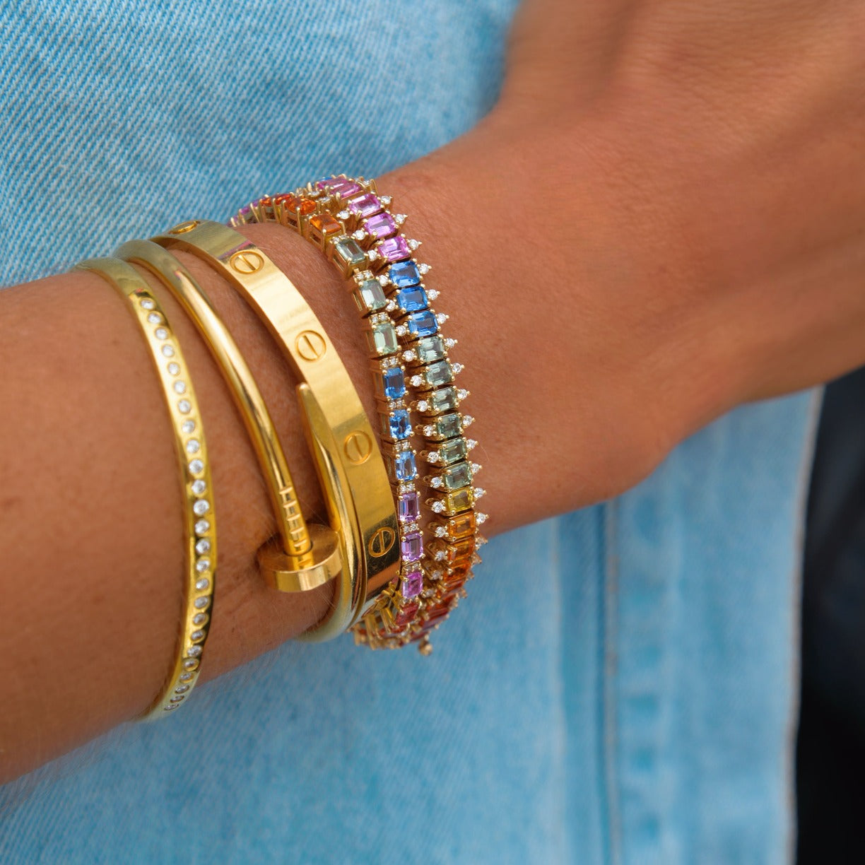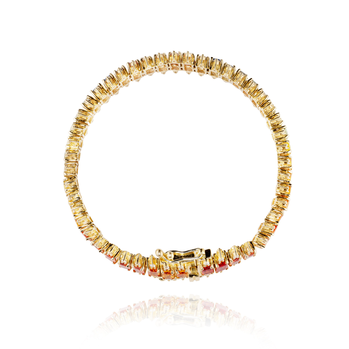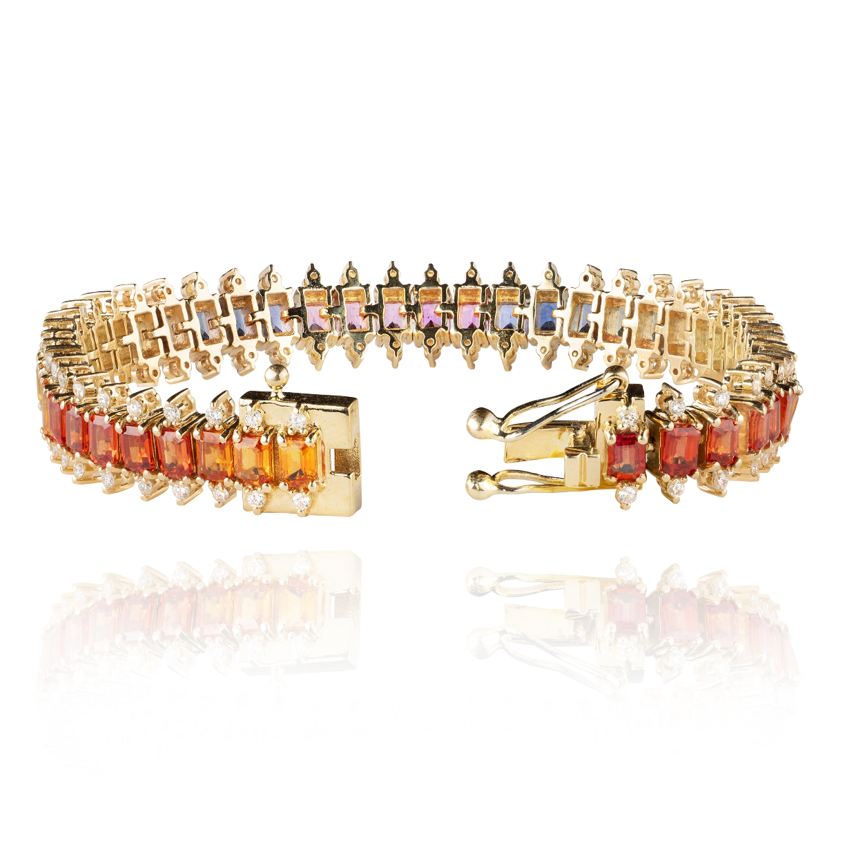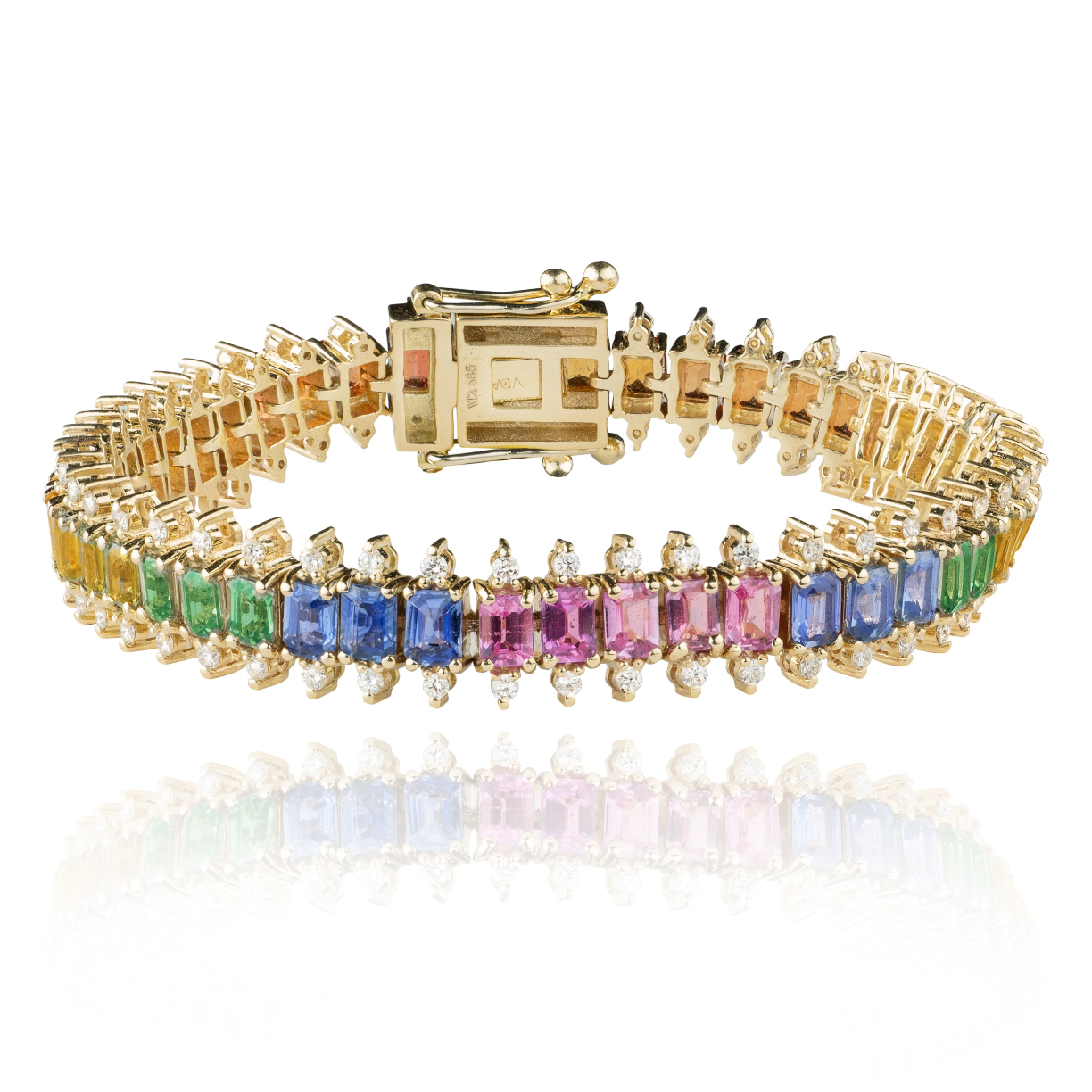 14k yellow gold bracelet adorned with multiple rainbow gradient sapphires , each decorated on either side with 2 small diamonds .