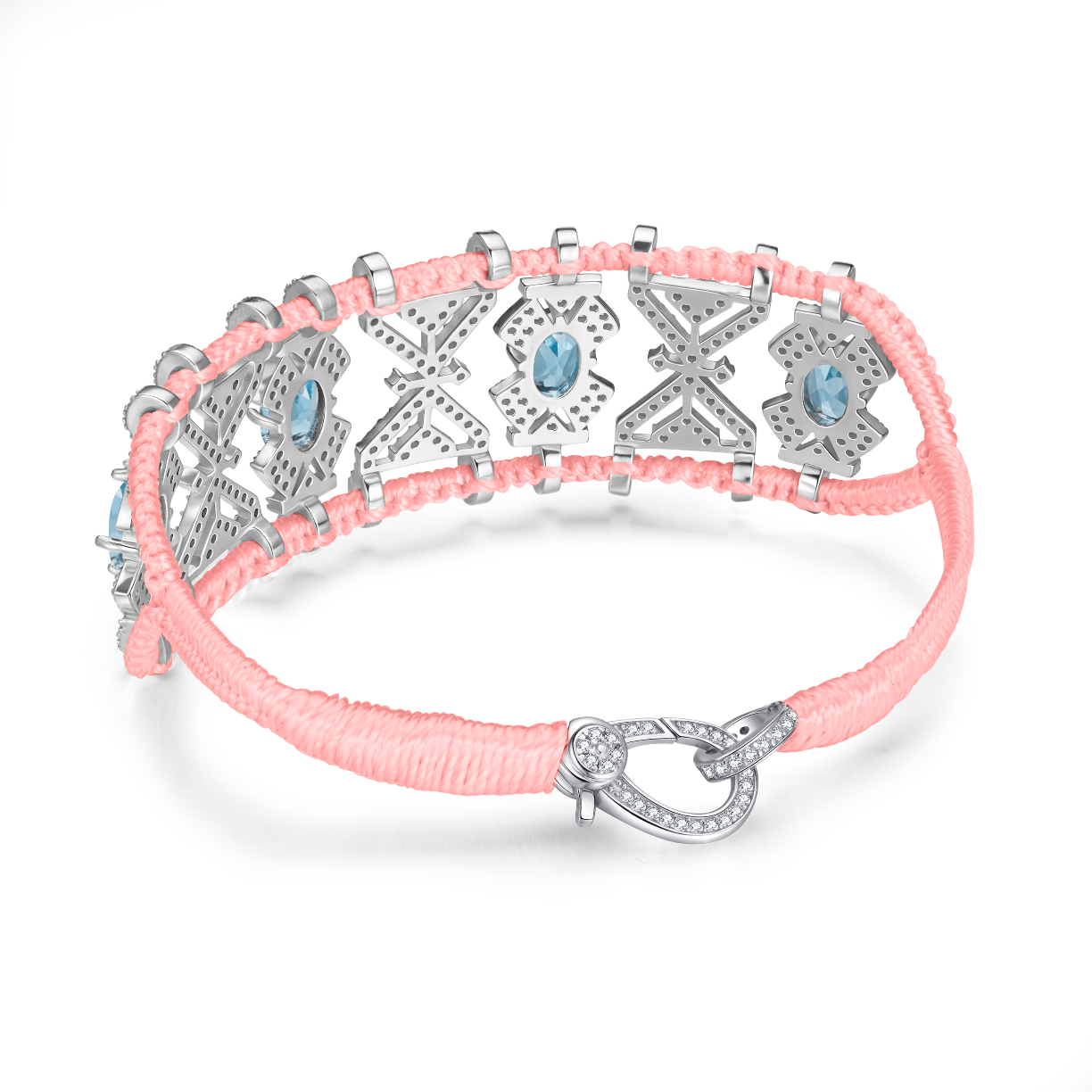 Openwork bracelet in neon-coral pink braided cotton thread adorned with a 925 silver motif entirely paved with moissanites and enhanced with Topazes.
