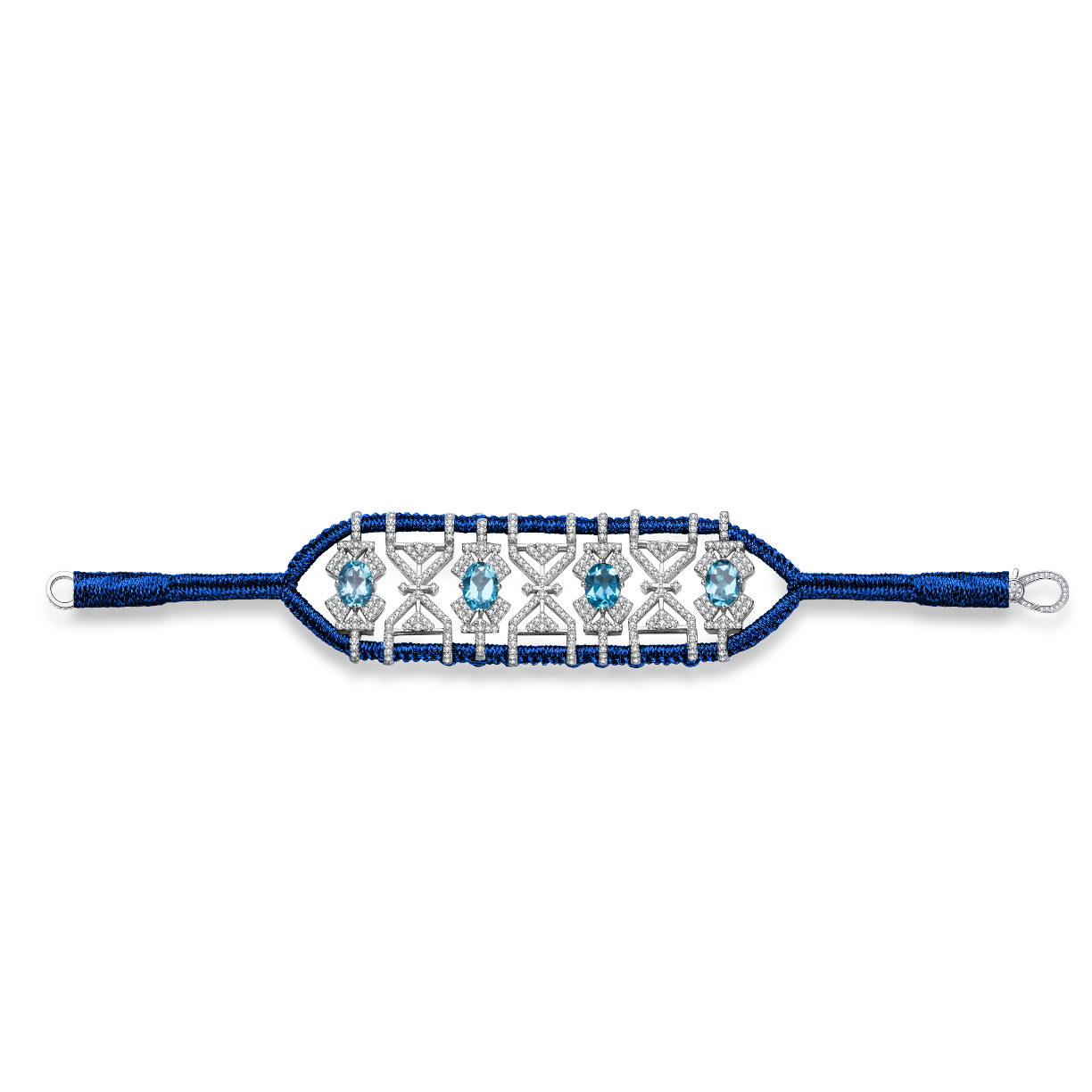 Openwork bracelet in night blue braided lurex thread adorned with a 925 silver motif entirely paved with moissanites and enhanced with Topazes.