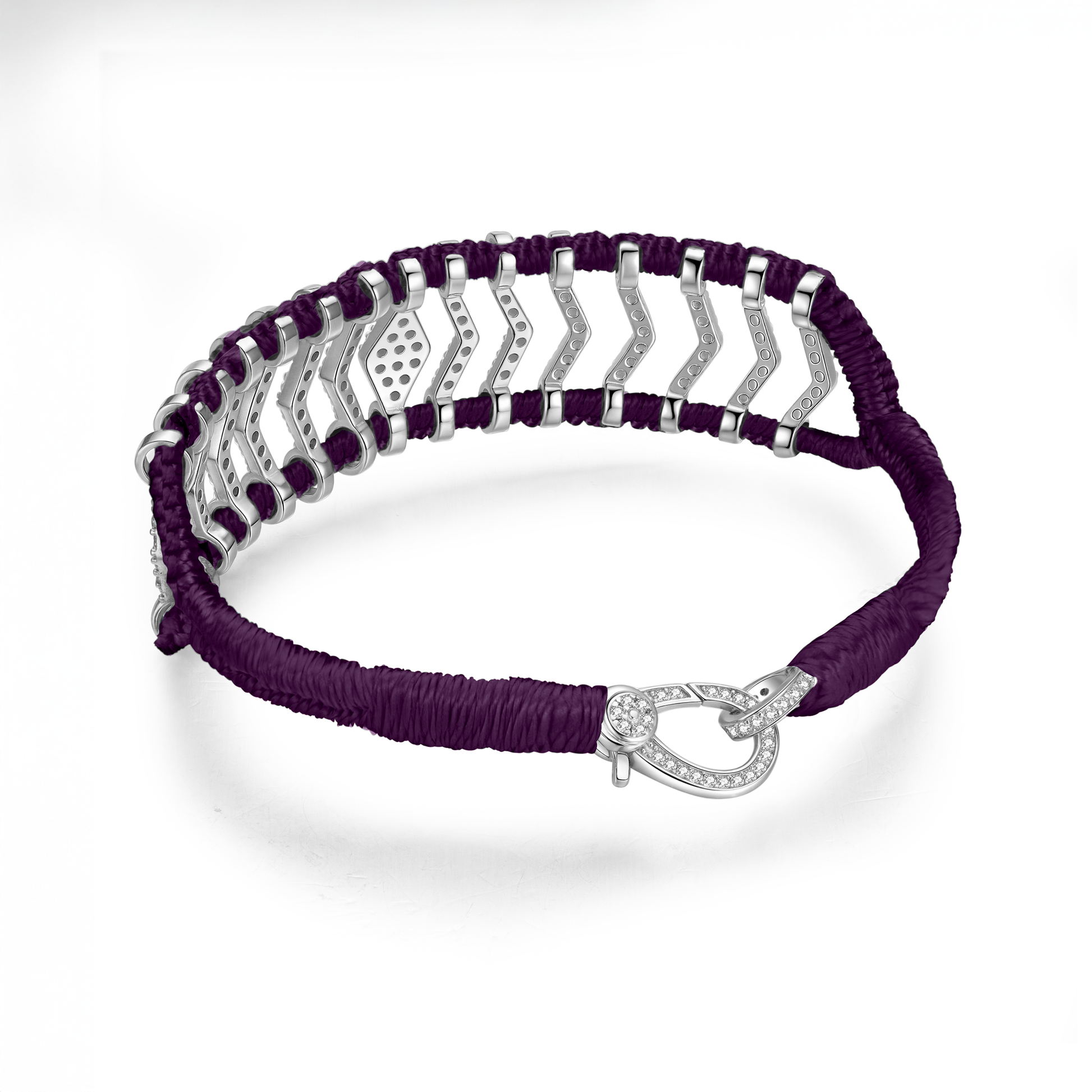 Fine bracelet made of eggplant braided lurex thread, decorated with a 925 silver pattern and set with moissanites.