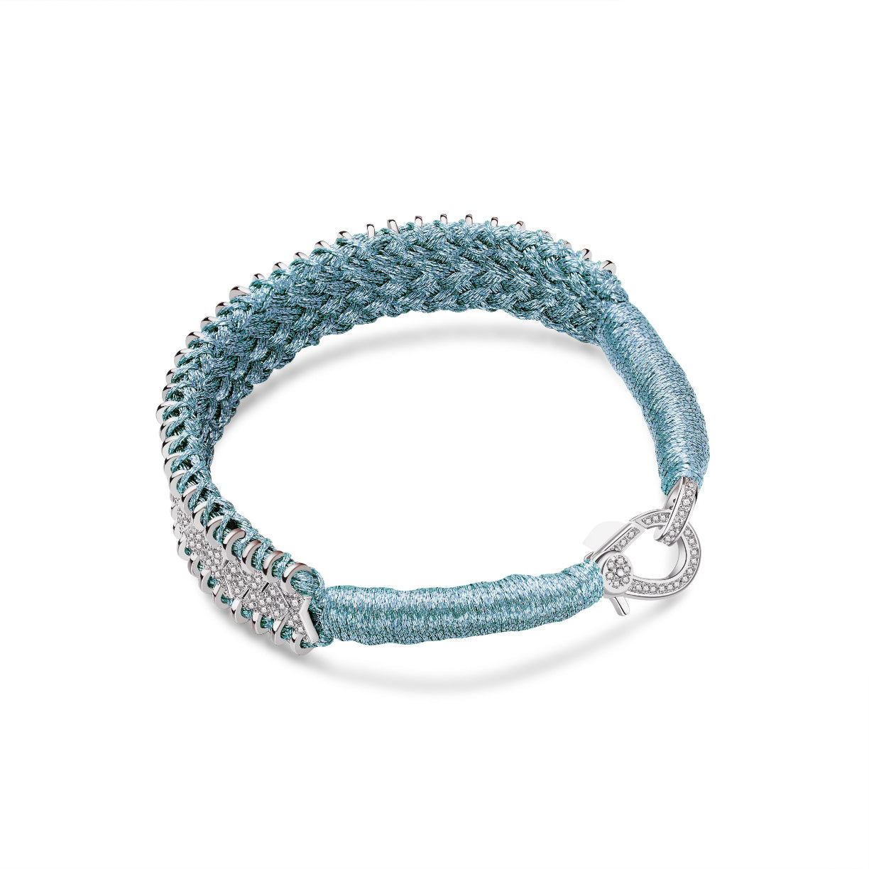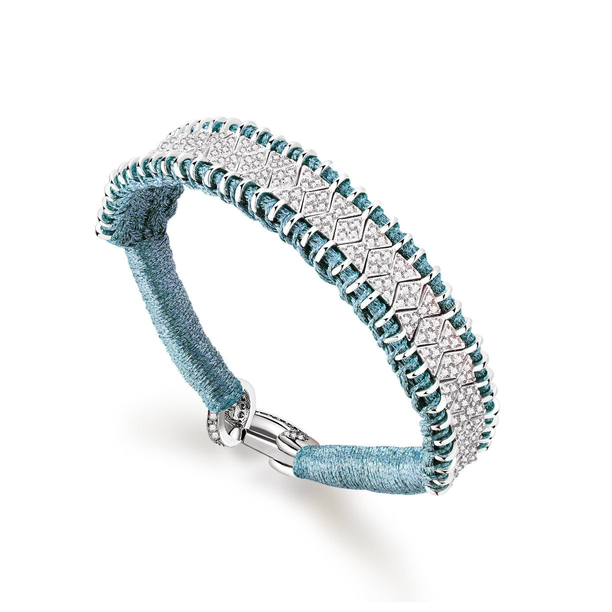Bracelet in blue sky braided lurex thread, decorated with a 925 silver pattern and set with a multitude of diamonds.