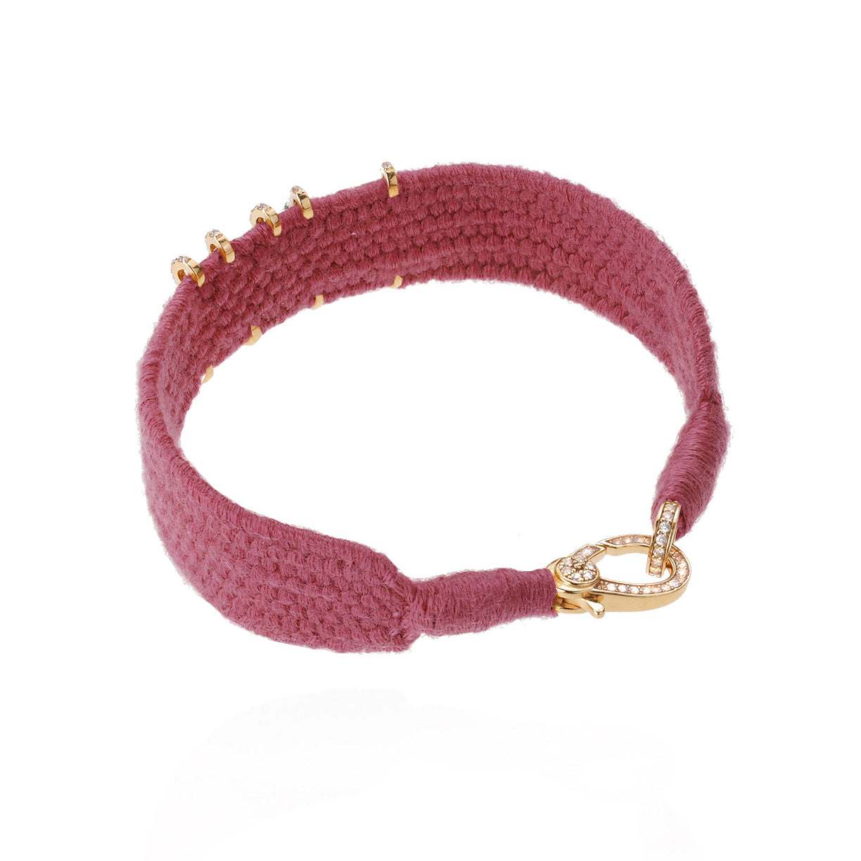 Braided bamboo-colored cotton thread bracelet, adorned with 18k Gold plated 925 Silver letters set with a multitude of moissanites.