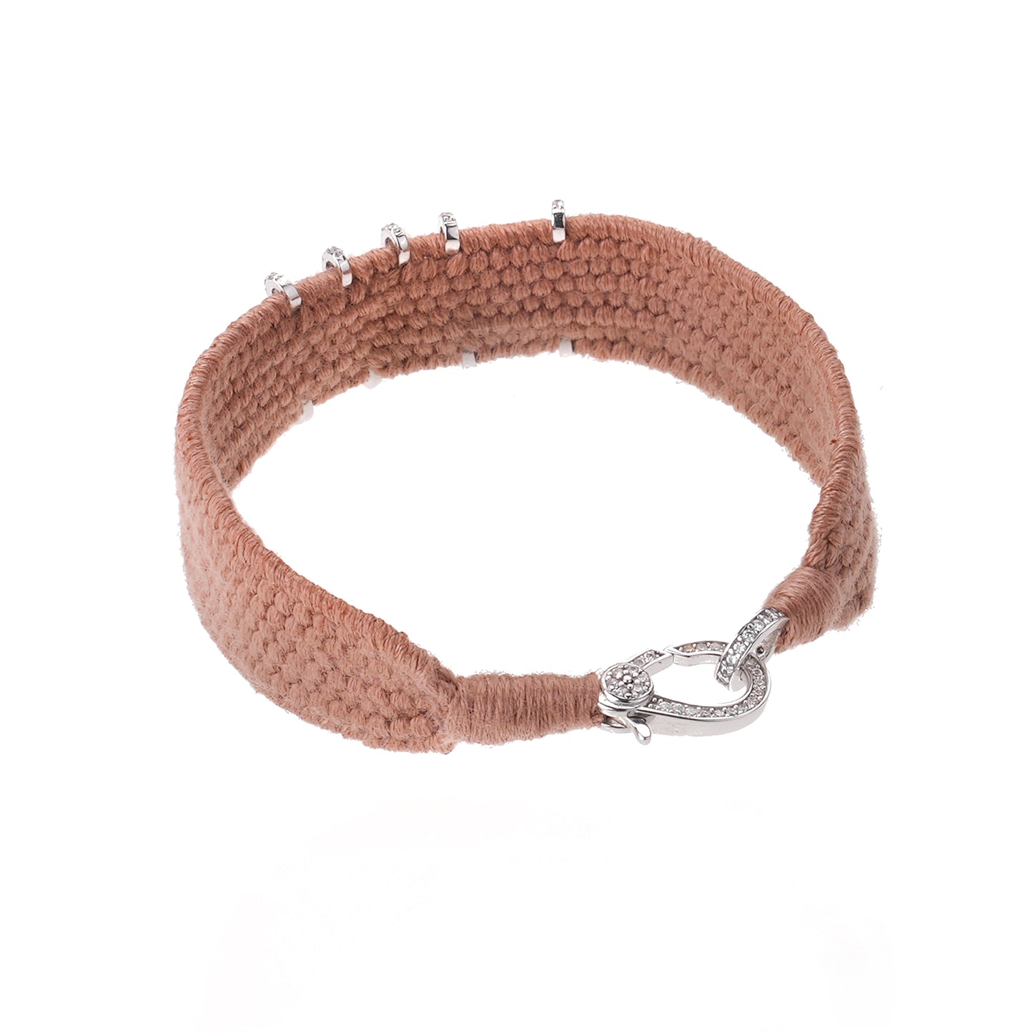 Braided blush-colored cotton thread bracelet, adorned with 925 Silver letters set with a multitude of moissanites