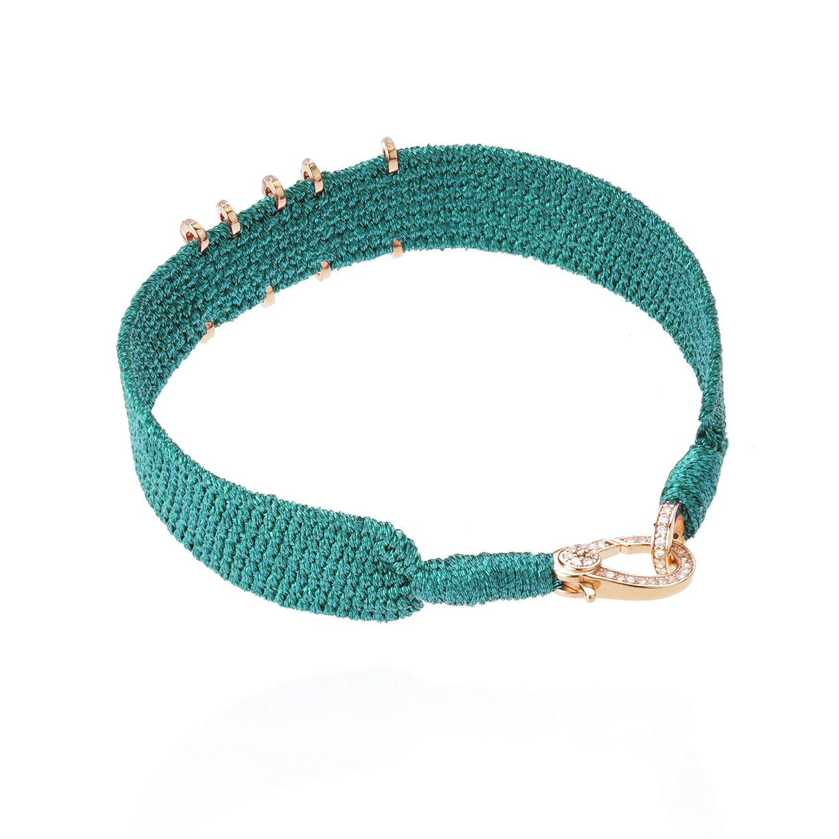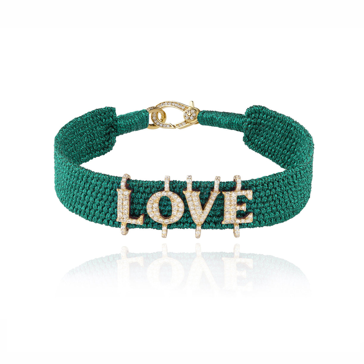 Braided emerald-colored lurex thread bracelet, adorned with 18k Gold plated 925 Silver letters set with a multitude of moissanites.