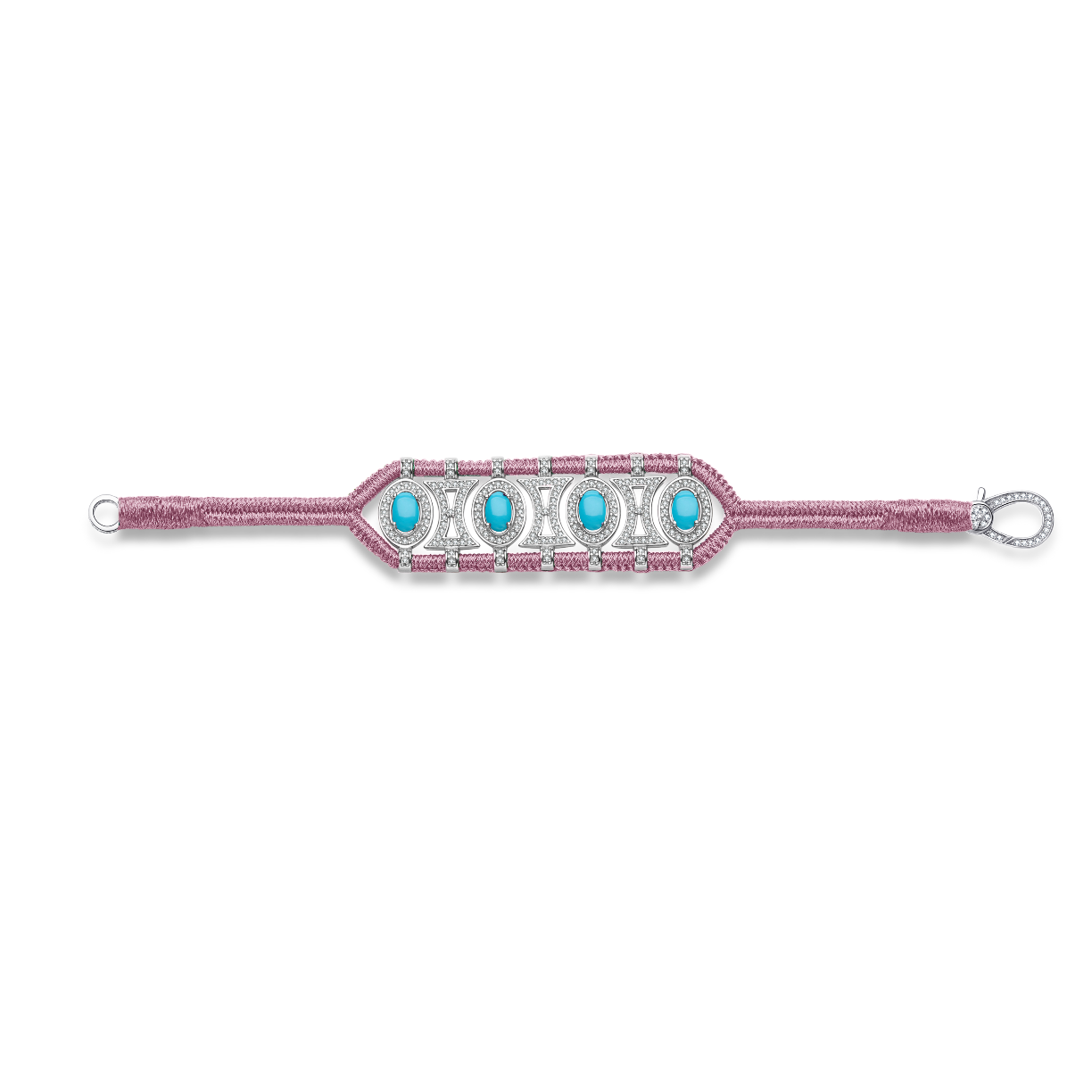 Openwork bracelet made of baby pink braided lurex thread, adorned with a 925 sterling silver structure fully set with moissanites and enhanced with oval Turquoises.
