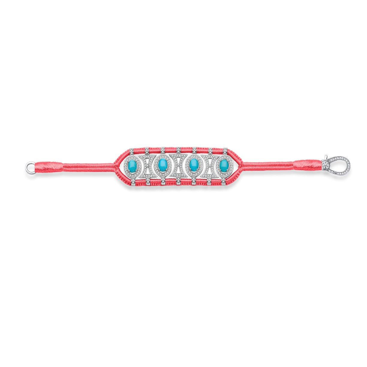 Openwork bracelet made of cheeks color braided cotton thread, adorned with a 925 sterling silver structure fully set with moissanites and enhanced with oval Turquoises.