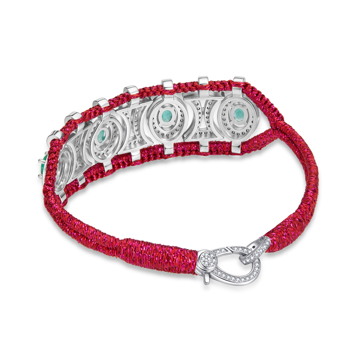 Openwork bracelet made of cherry color braided lurex thread, adorned with a 925 sterling silver structure fully set with moissanites and enhanced with oval Emeralds.
