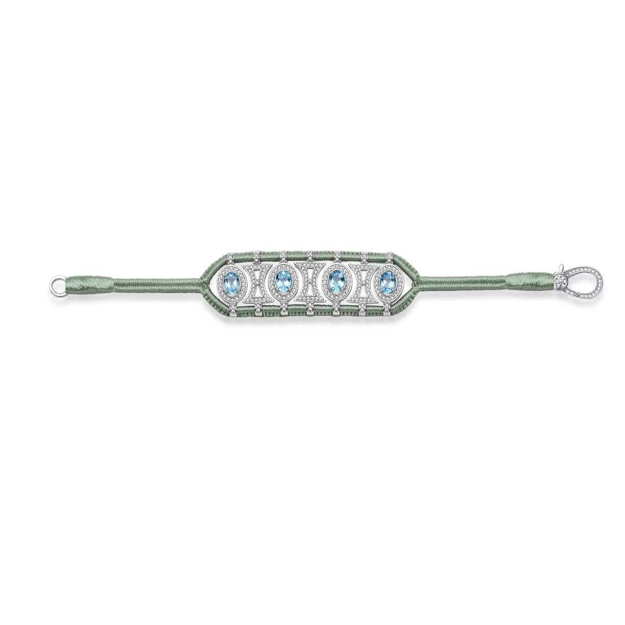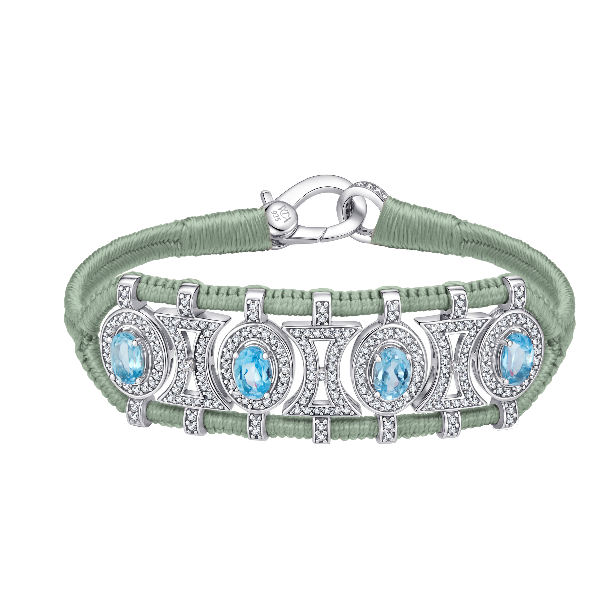 Openwork bracelet made of moss color braided cotton thread, adorned with a 925 sterling silver structure fully set with moissanites and enhanced with oval blue Swiss Topazes.