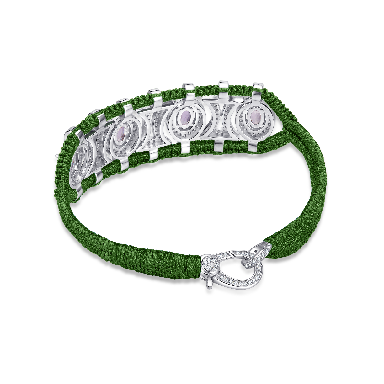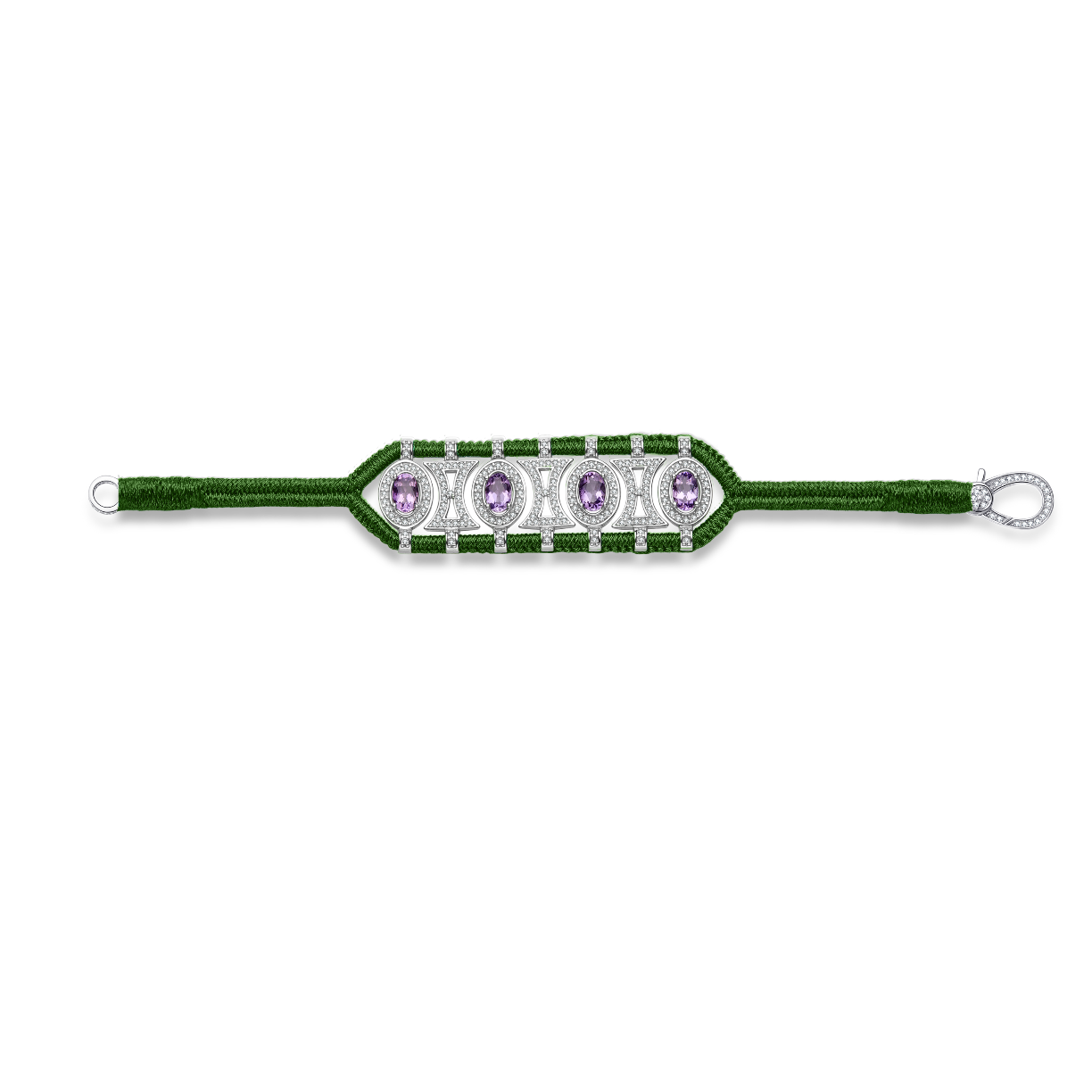 Openwork bracelet made of pacific blue braided lurex thread, adorned with a 925 sterling silver structure fully set with moissanites and enhanced with oval amethysts.