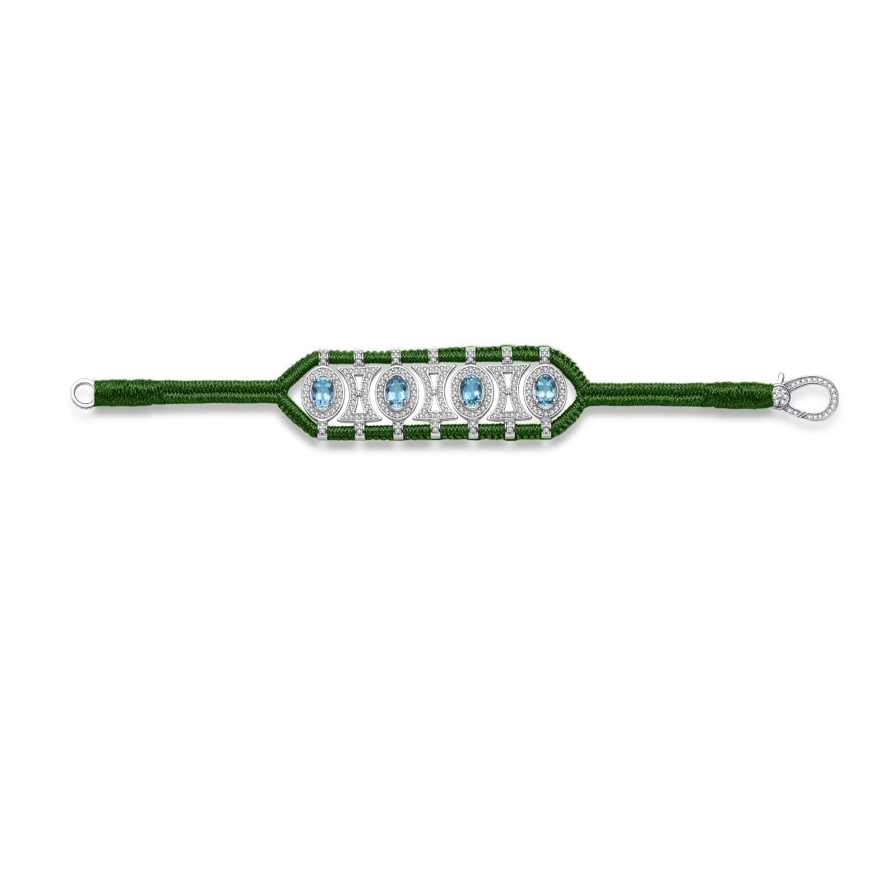 Openwork bracelet made of pine-tree green braided lurex thread, adorned with a 925 sterling silver structure fully set with moissanites and enhanced with oval Swiss blue Topazes.