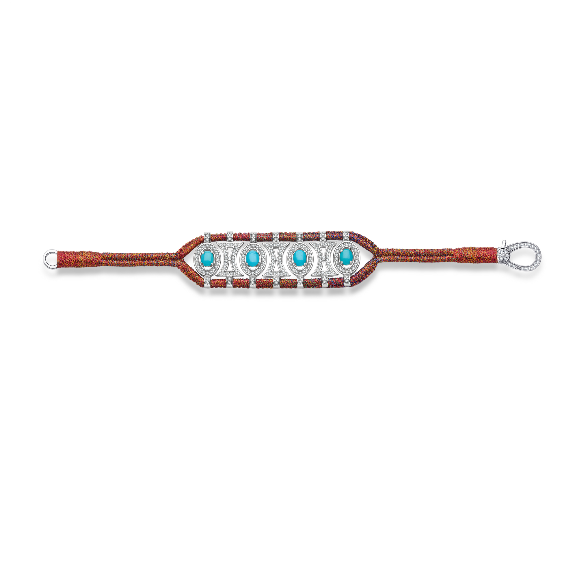 Openwork bracelet made of red shanti braided lurex thread, adorned with a 925 sterling silver structure fully set with moissanites and enhanced with oval Turquoises.