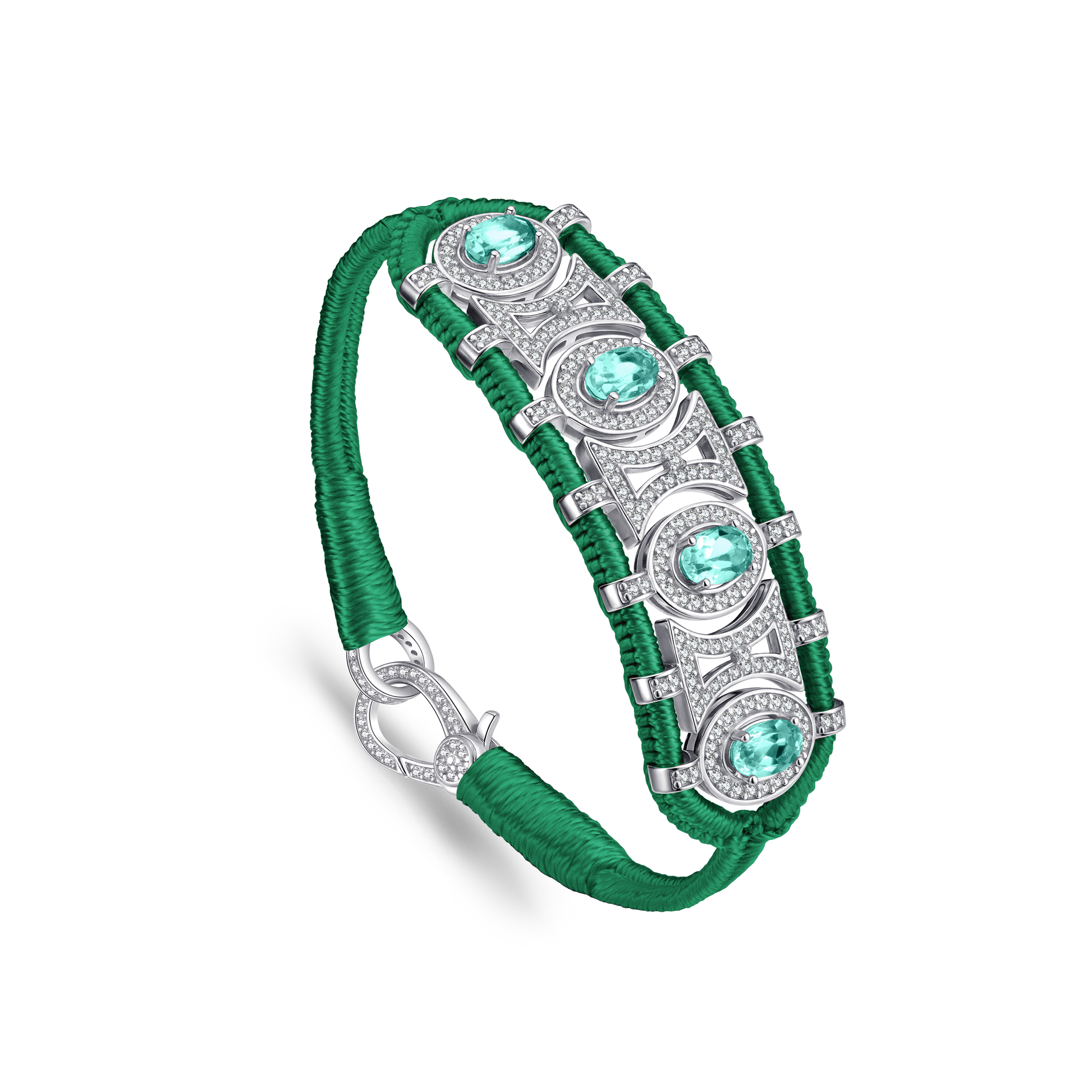 Openwork bracelet made of vanilla color braided cotton thread, adorned with a 925 sterling silver structure fully set with moissanites and enhanced with oval Emeralds.