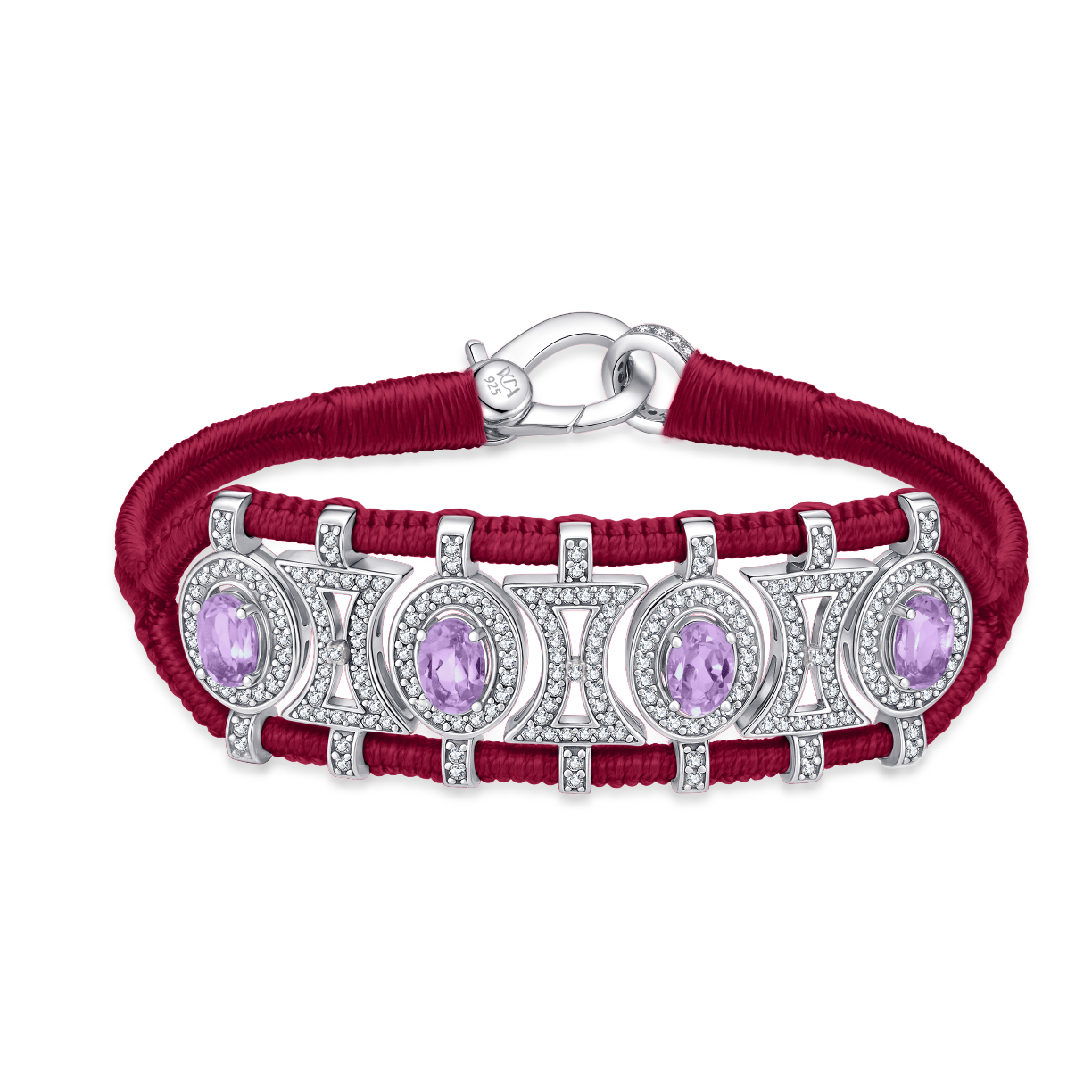 Openwork bracelet made of vine color braided cotton thread, adorned with a 925 sterling silver structure fully set with moissanites and enhanced with oval amethysts.